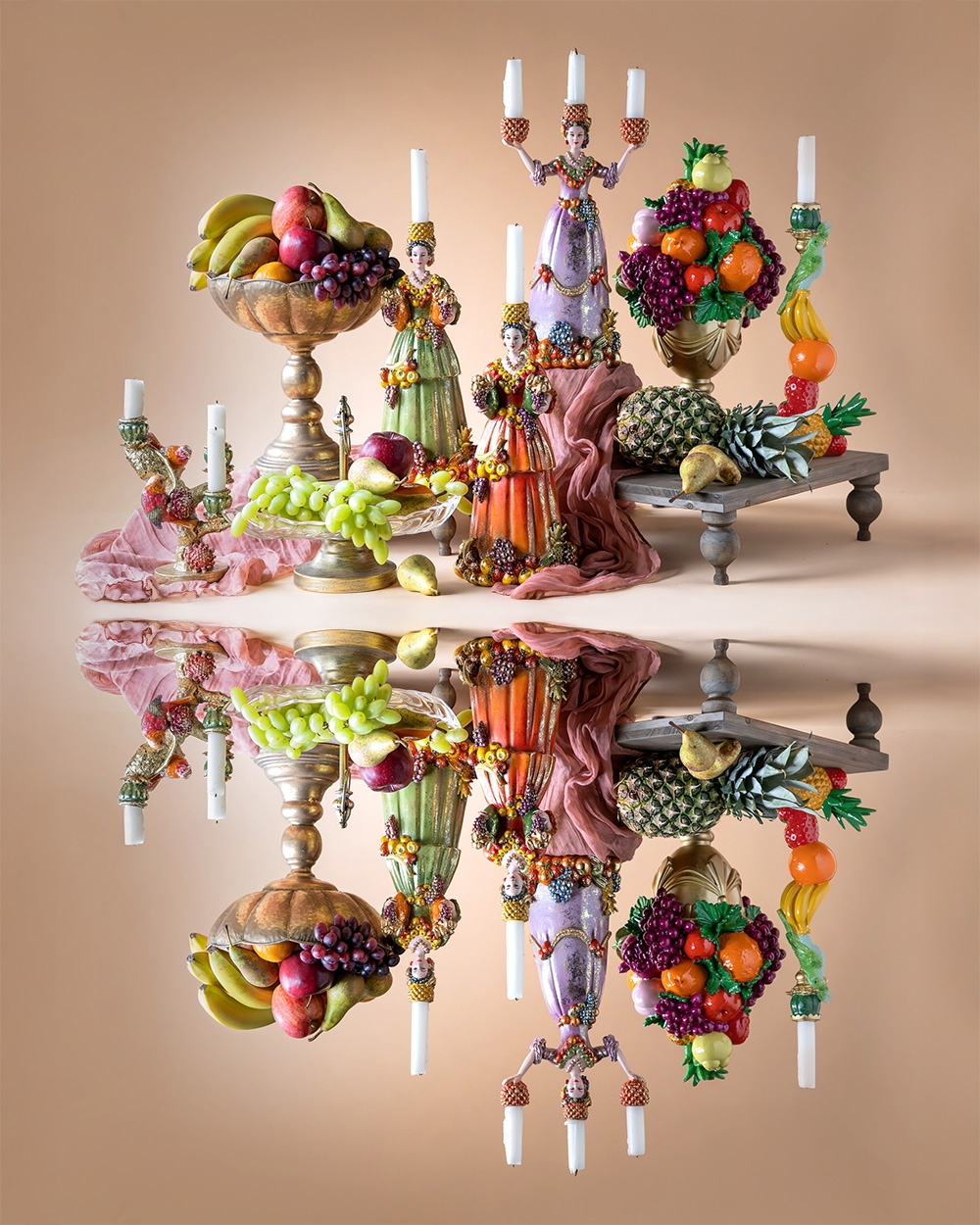 Dekorer med eleganse og lekenhet med en fin trearmet lysestake som forestiller en kvinne i kjole med diverse frukter. Laget av polyetylen.