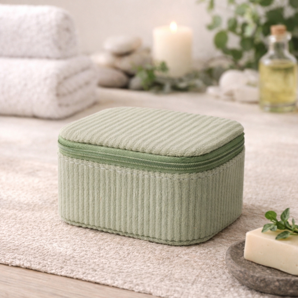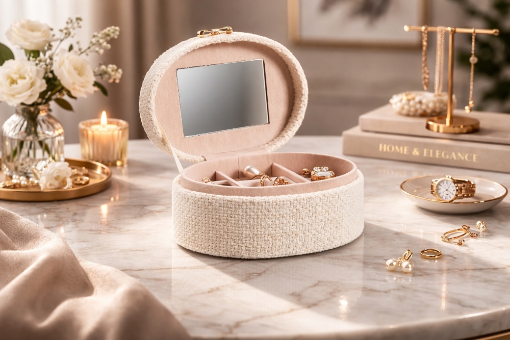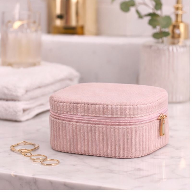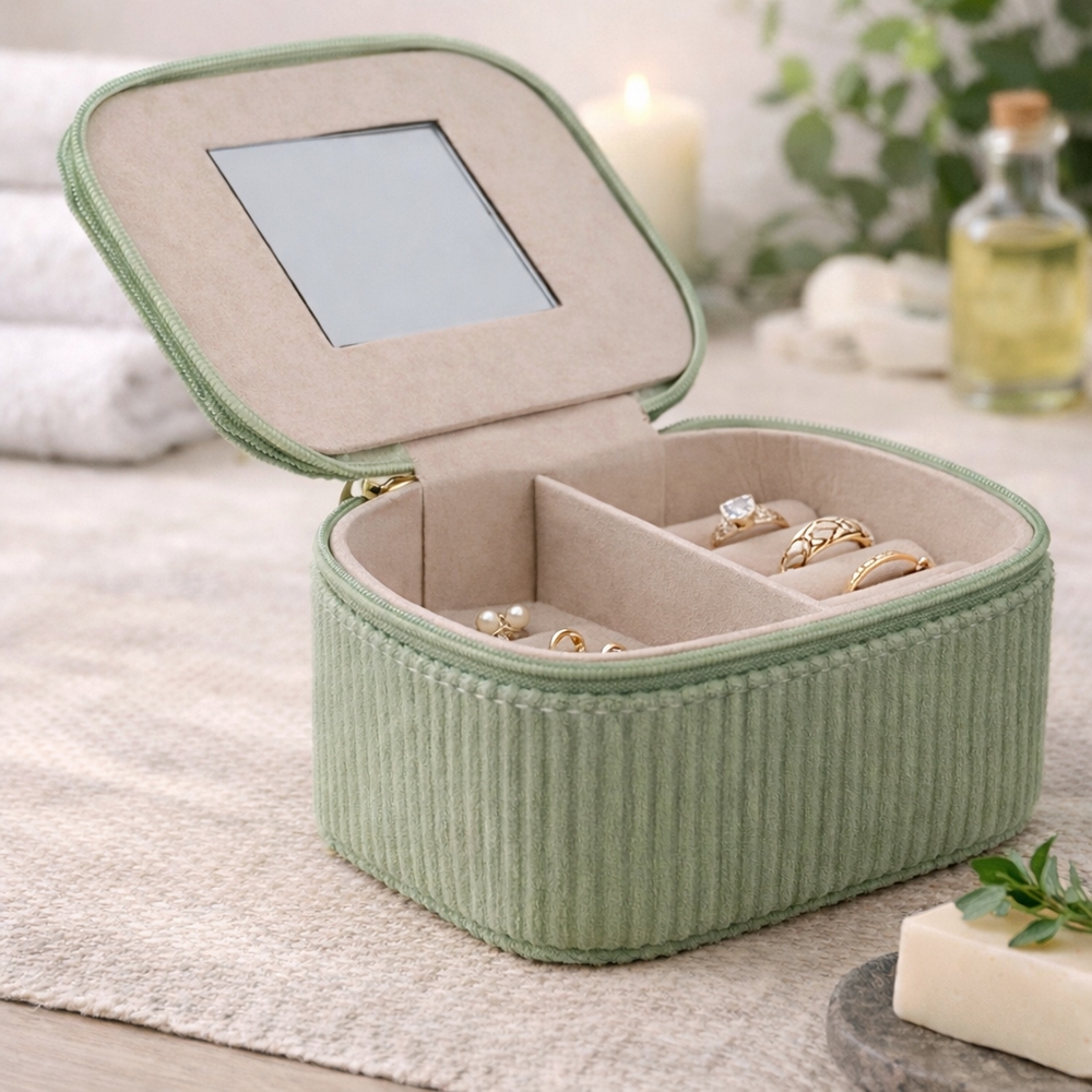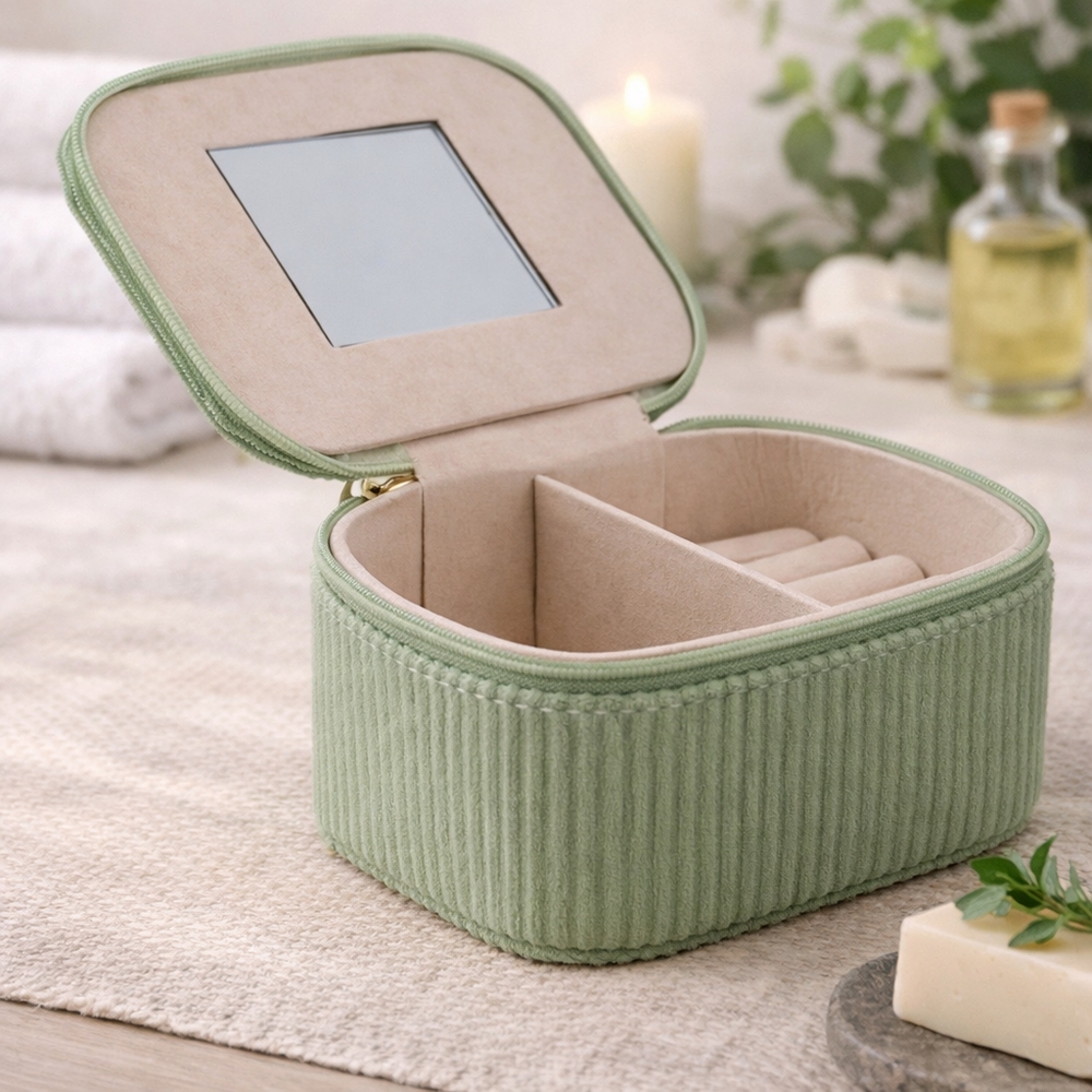 11 x 9 x 5,5 cm. Flere rom og speil i smykkeskrinet. Glidelås i gullfarge.