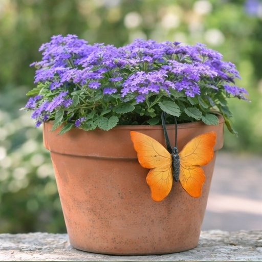 Hver sommerfugl er 13 x 10 x 5 cm. Koselig pynt til blomsterpottene. Hver sommerfugl har en krok bak slik at man kan henge den over kanten på potten.