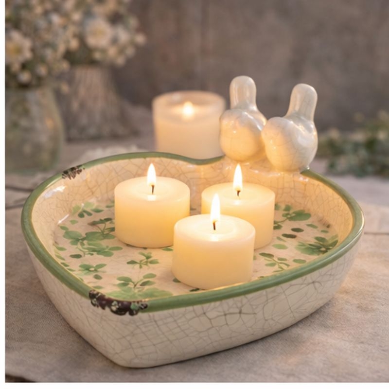 Fuglebadet har en håndlaget hjerteform, blank glasur, blomstertrykk rundt hele verket og krakeleringseffekt. Bredden er 20 cm, lengden 19 cm og høyden er 7,5 cm. Fuglebadet er frostbestandig, noe som sikrer at det er egnet for utendørs bruk året rundt.