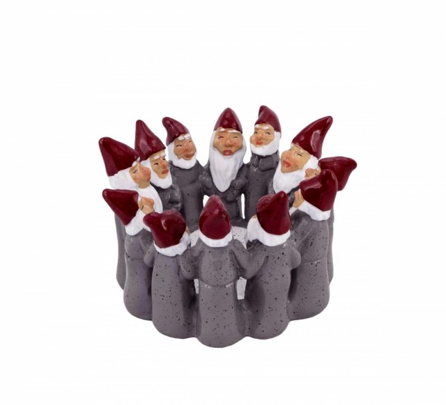 Disse 6 nissene, kledd i røde luer og frakker, spiller hvert sitt instrument rundt et bål. Med to trekkspill, et munnspill, en gitar, en bass og en sanger er denne gruppen mer en klar for å spille noen glade julesanger! Rom for telys.