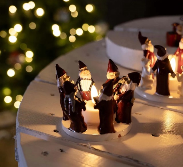 Disse 6 nissene, kledd i røde luer og frakker, spiller hvert sitt instrument rundt et bål. Med to trekkspill, et munnspill, en gitar, en bass og en sanger er denne gruppen mer en klar for å spille noen glade julesanger! Rom for telys.