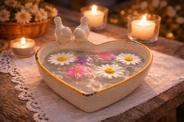 Fuglebadet har en håndlaget hjerteform, blank glasur, blomstertrykk rundt hele verket og krakeleringseffekt. Bredden er 20 cm, lengden 19 cm og høyden er 7,5 cm. Fuglebadet er frostbestandig, noe som sikrer at det er egnet for utendørs bruk året rundt.