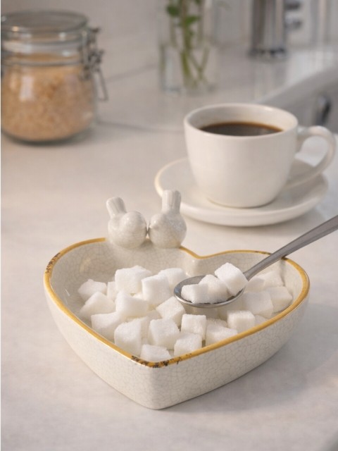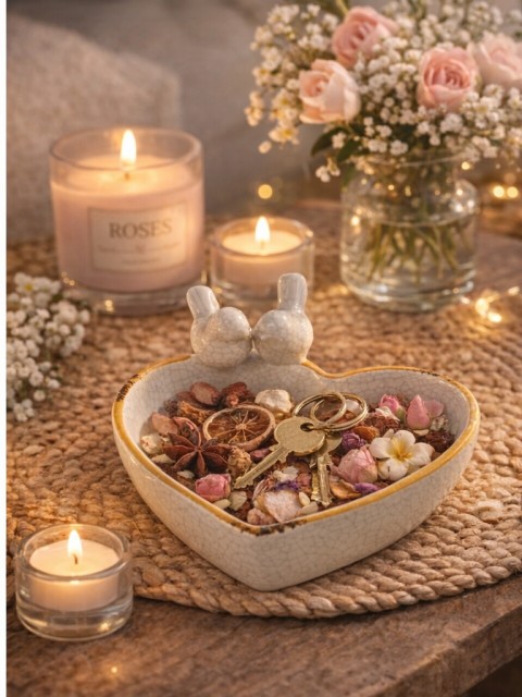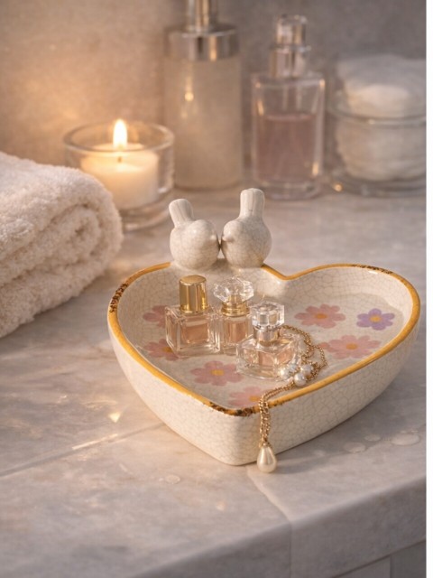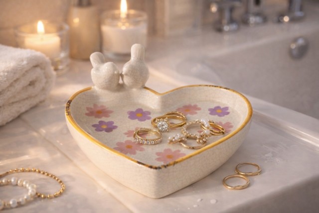 Fuglebadet har en håndlaget hjerteform, blank glasur, blomstertrykk rundt hele verket og krakeleringseffekt. Bredden er 20 cm, lengden 19 cm og høyden er 7,5 cm. Fuglebadet er frostbestandig, noe som sikrer at det er egnet for utendørs bruk året rundt.