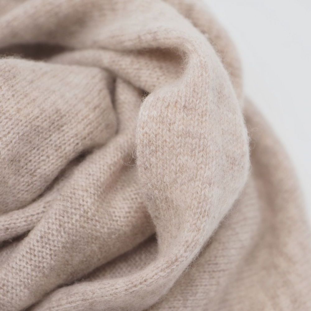 Merinoull triangelskjerf i melert beige. Deilig mykt skjerf som ikke klør. Lengde 130 cm, høyde 75 cm.