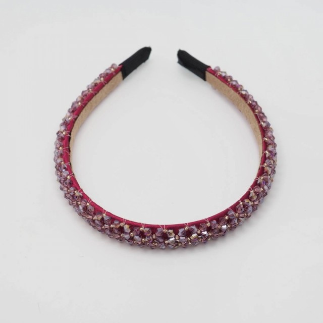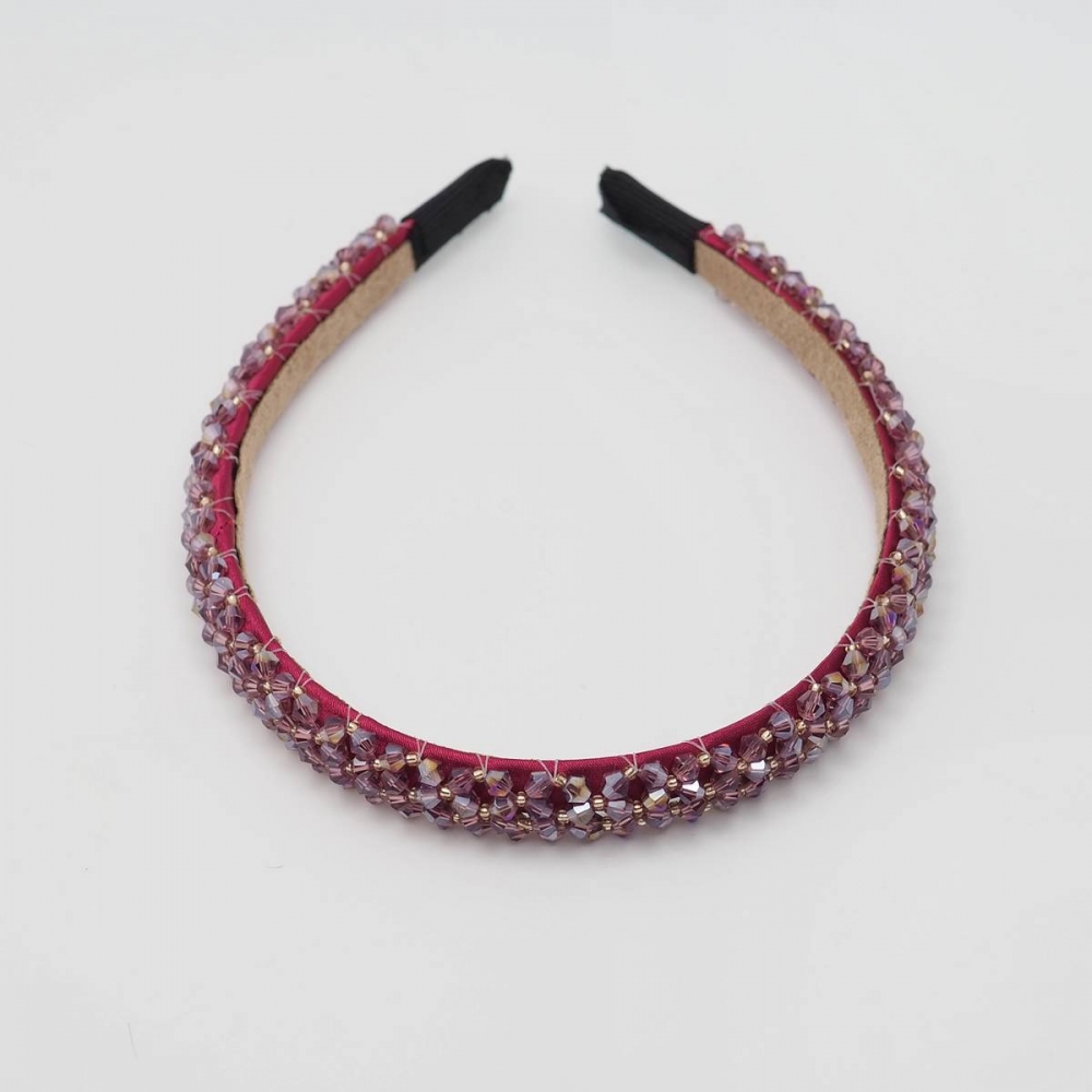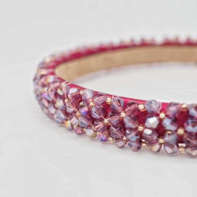 Denne smale hårbøylen er dekorert med vakre burgunder rosa glassperler som gir et sofistikert og elegant uttrykk. Med en bredde på cirka 2,5 cm er den ideell til både sommerfester og varme juleselskaper!