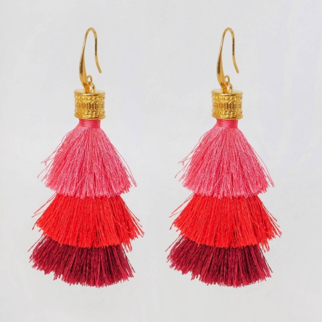 Øredobb med tre fargede dusker rød Artikkelnr.: 7days Øredobb med dusker i tre ulike rød toner. Titan i stiften i øret som er forgylt med 24 karat gull. Duskene henger i en flott børstet gull sylinder. Håndlaget i Hellas. Lengde 8,5 cm. NOK199,00 inkl. mva. På lager Kjøp Del dette