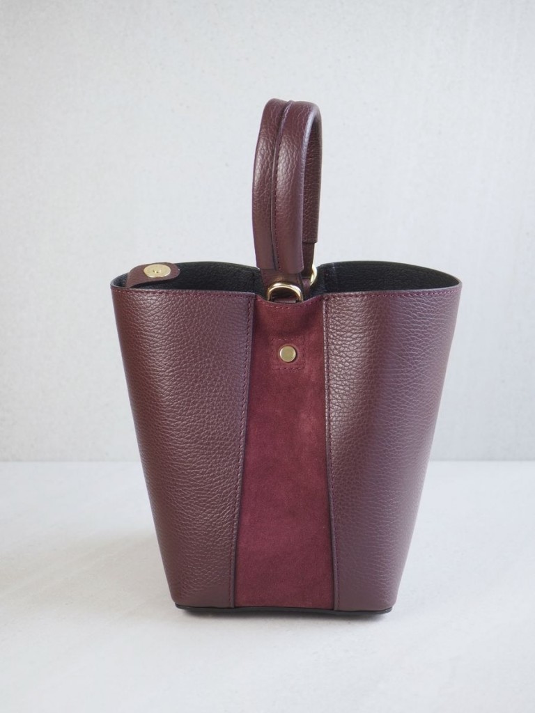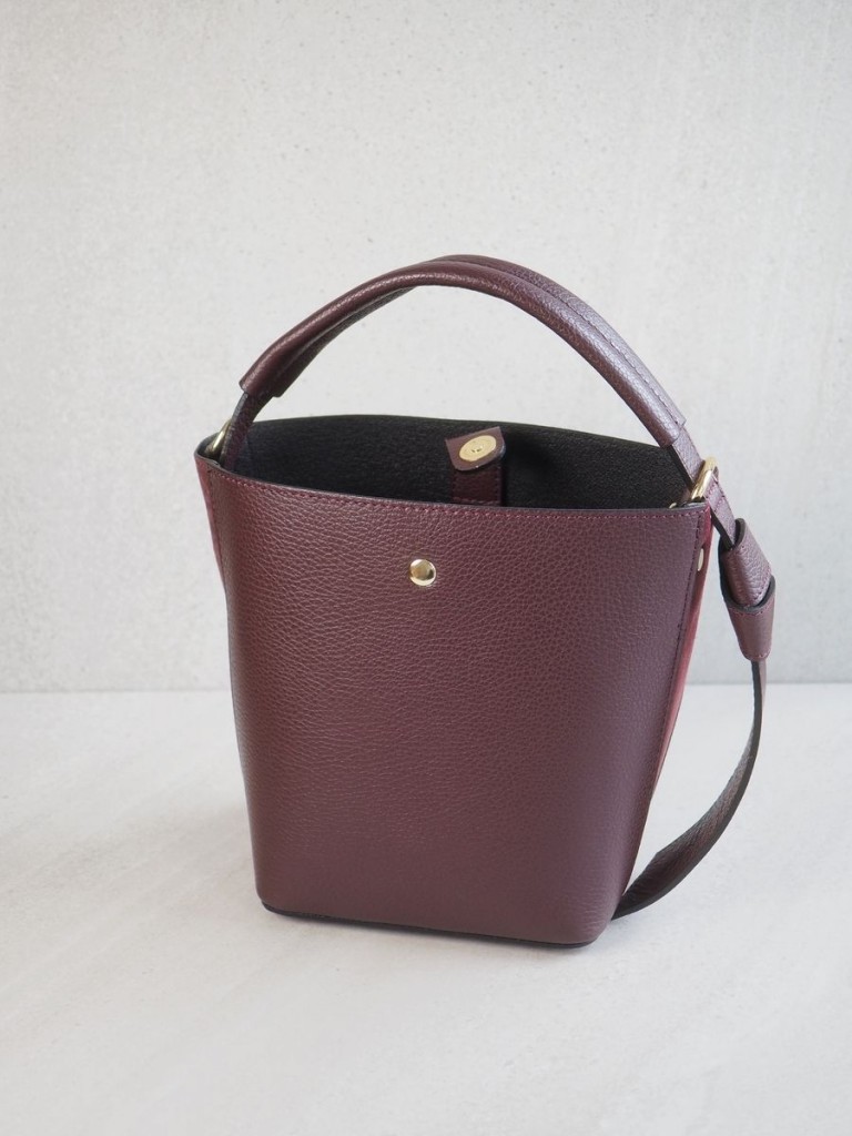 Bøtteveske i glatt skinn bordeaux Artikkelnr.: 7days Sofistikert og elegant bøtteveske i både semsket og glatt skinn. Vesken har et dekorativt knutebelte. Vesken har to stropper, en av dem er regulerbar og lang, den andre er en håndtak. NOK1 799,00 inkl. mva. På lager Kjøp Del dette Produktinfo Vesken lukkes med magnet og karabin. Vesken har liten sminkepung til verdisaker. Str: 21cm - 16cm - 14cm Lengde av håndtak: 13cm Str av regulerbar stropp på det korteste: 72cm, på det lengste: 132cm Produsert i Italia