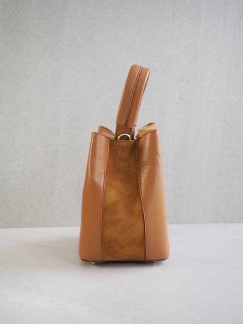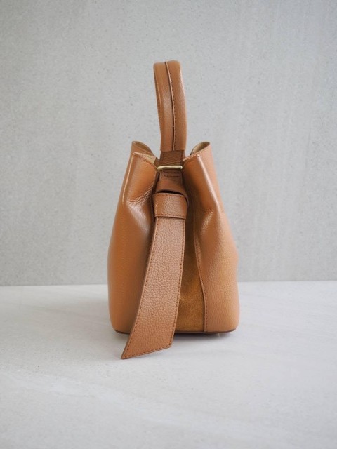Sofistikert og elegant bøtteveske i semsket og glatt skinn. Vesken har et dekorativt knutebelte. Vesken har to stropper, den lengste er regulerbar, den andre er et håndtak.