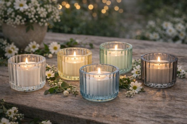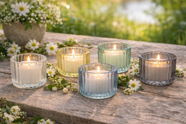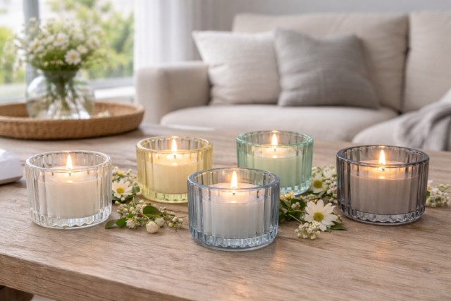 Duftlys i glass - sett med 5 stk Artikkelnr.: 121927 Glassene er 5 x 4 cm. Lys grå, mørk grå, gul, blå og grønn. Vokslys. NOK169,00 inkl. mva. På lager Kjøp Del dette