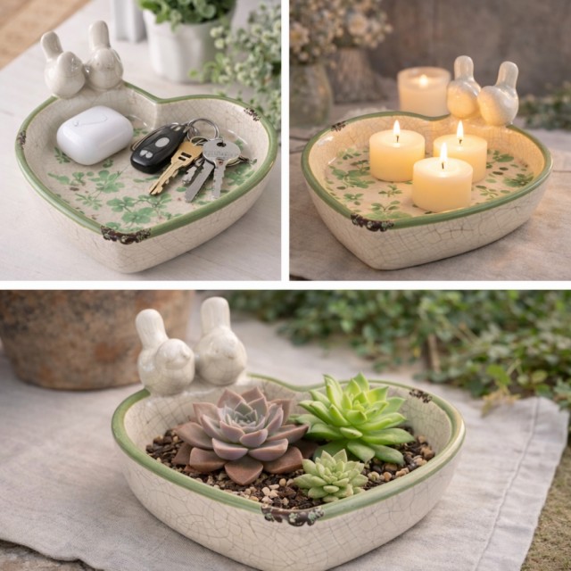 Fuglebad med 2 fugler Artikkelnr.: 2078350 Fuglebadet har en håndlaget hjerteform, blank glasur, blomstertrykk rundt hele verket og krakeleringseffekt. Bredden er 20 cm, lengden 19 cm og høyden er 7,5 cm. Fuglebadet er frostbestandig, noe som sikrer at det er egnet for utendørs bruk året rundt. NOK349,00 inkl. mva. På lager Kjøp Del dette