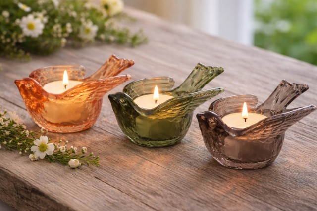 Telysholdere i glass - sett med 3 stk Artikkelnr.: 127679 Telysholdere formet som fugler i tre farger; amber, brun og grønn. Prisen er for alle tre. Hver fugl er 13 x 12 x 6 cm. NOK295,00 inkl. mva. På lager Kjøp Del dette