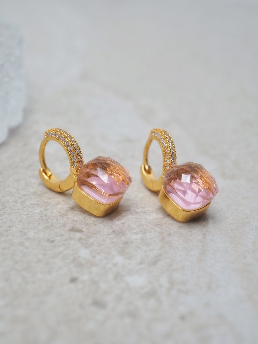 De freshe og lekre Adele øredobbene med lyserosa transparent glasstein er et feminint og elegant tilskudd til smykkeskrinet. De blanke steinene langs bøylen tilfører akkurat passe glans – perfekt til både hverdag og fest. Disse små hoopsene på ca. 2 cm e