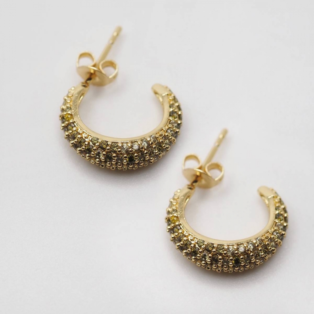 Klassiske og tidløse øredobber med olivenfargede steiner/zirkonia. Øredobbene er belagt med 18k gull. Øredobbene er ikke tunge. Størrelse: ca 1.7cm Nikkelfri.