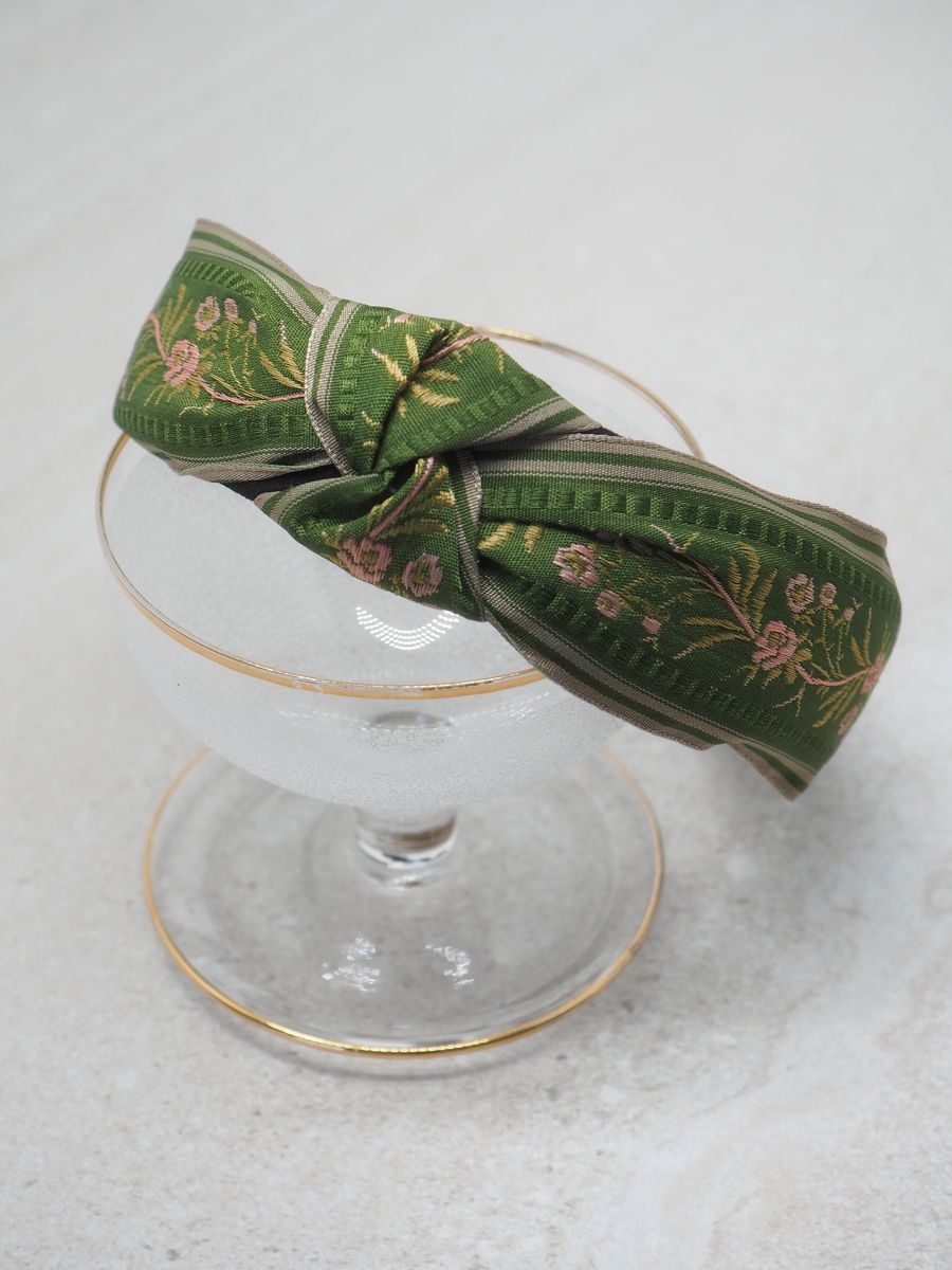 Hårbøyle grønn med broderi. Bredde ca 4 cm.