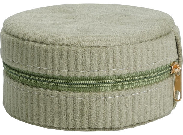 9,5 x 5,5 cm. Flere rom og speil i smykkeskrinet. Glidelås i gullfarge.