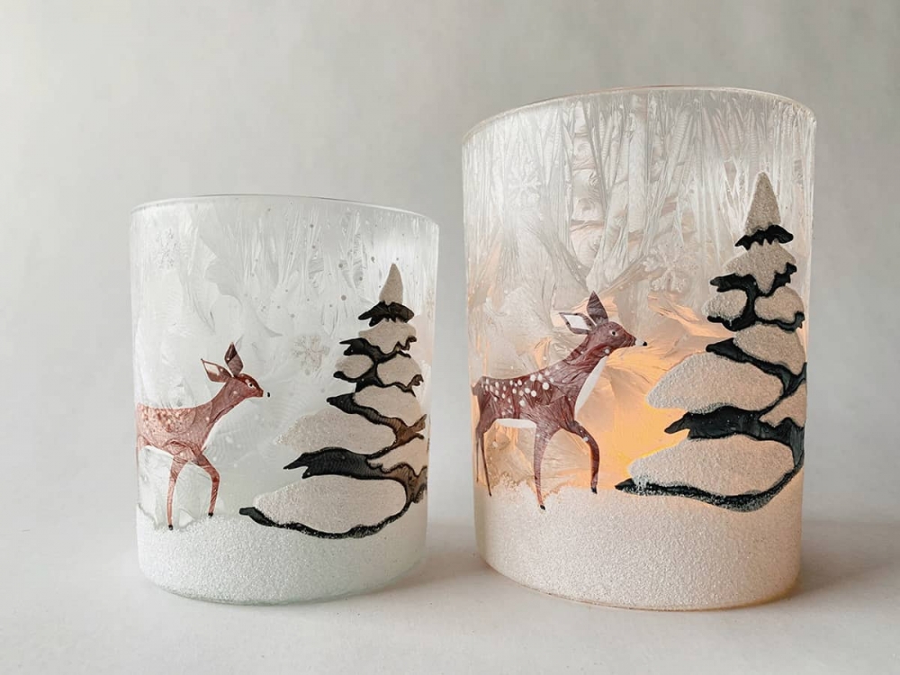 Herlig motiv med klare og fine farger. Det som er ekstra spesielt med disse lysglassene som finnes i to størrelser er at motivet er tosidig og dette gir en fin effekt! Dette glasset er 8 cm høyt.