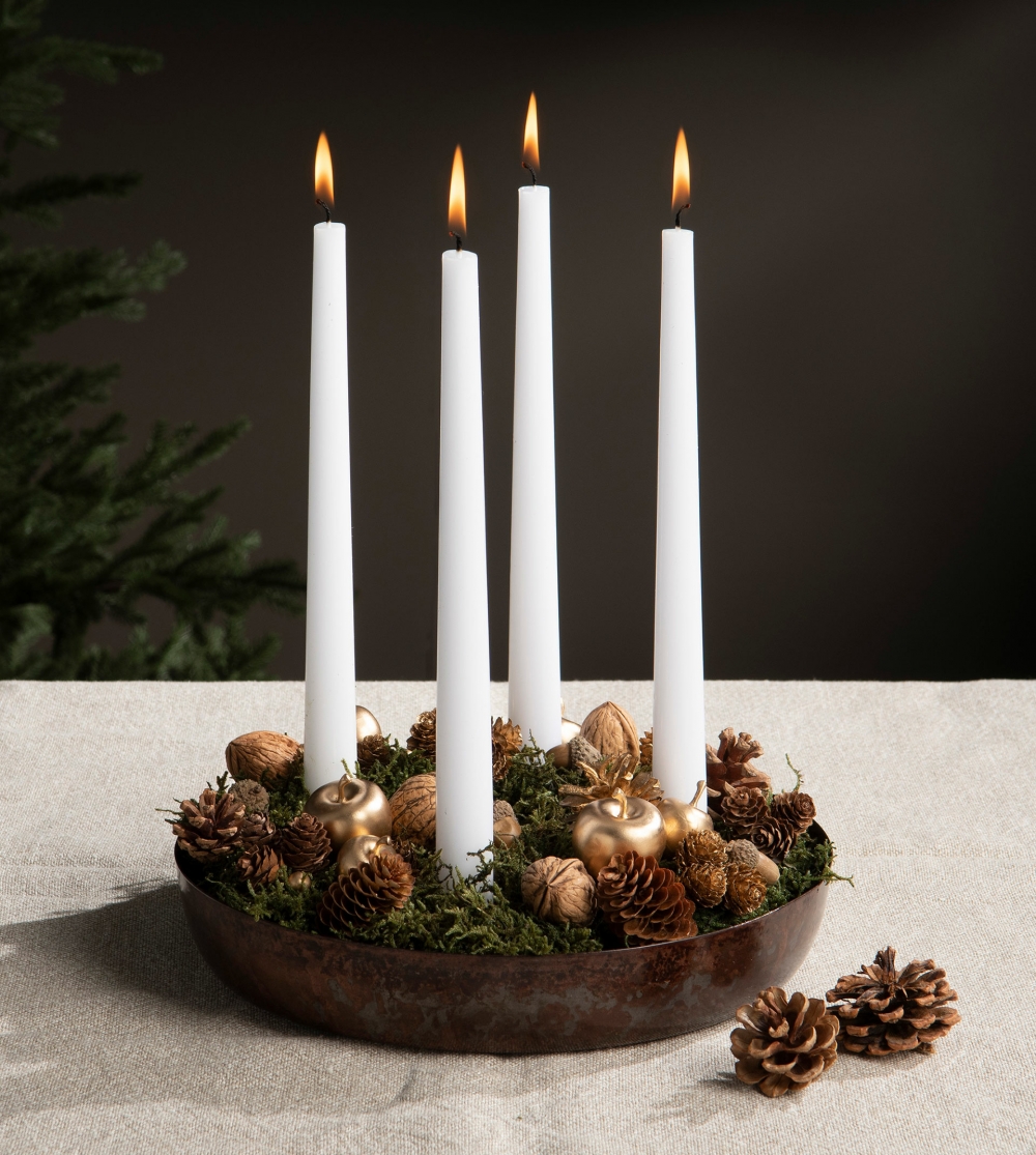 Adventsstaken er 27 cm bred og 13 cm høy. Kjempekoselig å dekorere i med frukt, granbar, kongler, kuler eller litt av hvert. Solide lysholdere til kubbelys.
