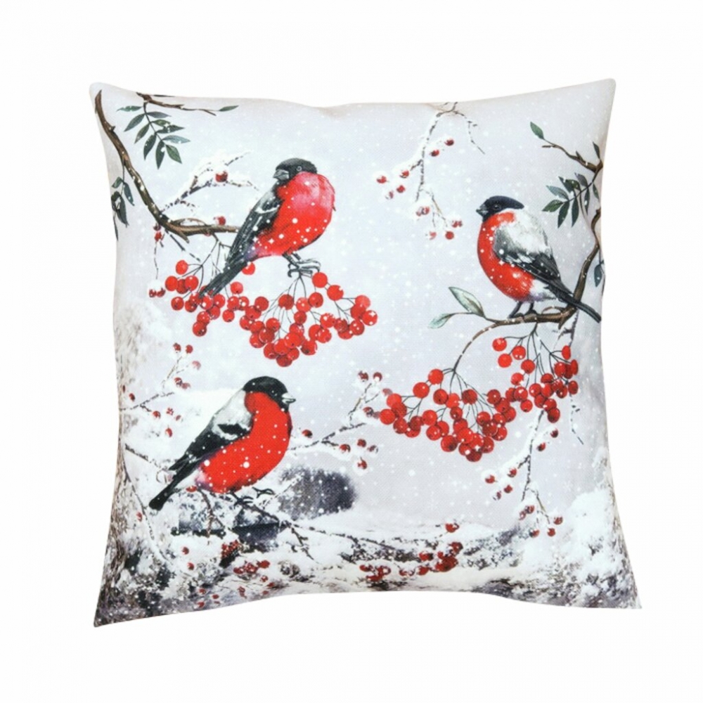 Koselig julepute med dompapp motiv. Fiberfyll, 45 x 45 cm.