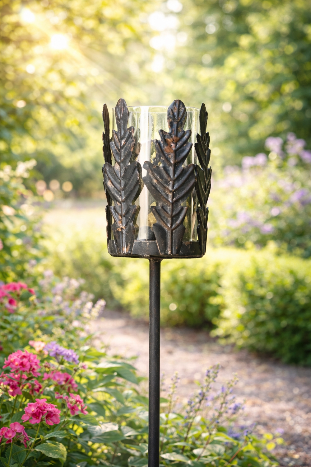 Metallblomst på pinne til fakkelboks