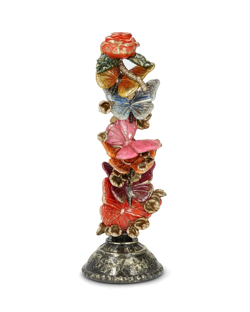 Leken lysestake med sommerfugler. Størrelsen er ca 13 cm i diameter og 35 cm høy. Passer til kronelys.