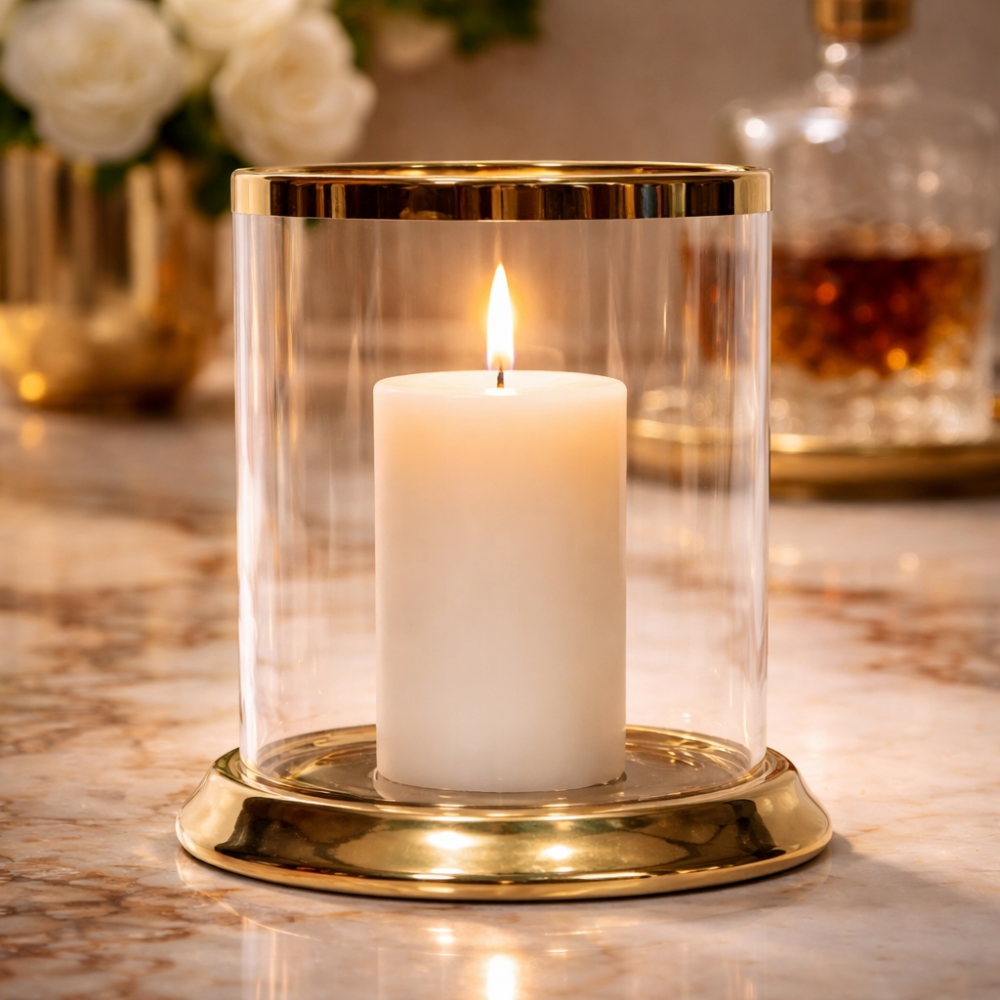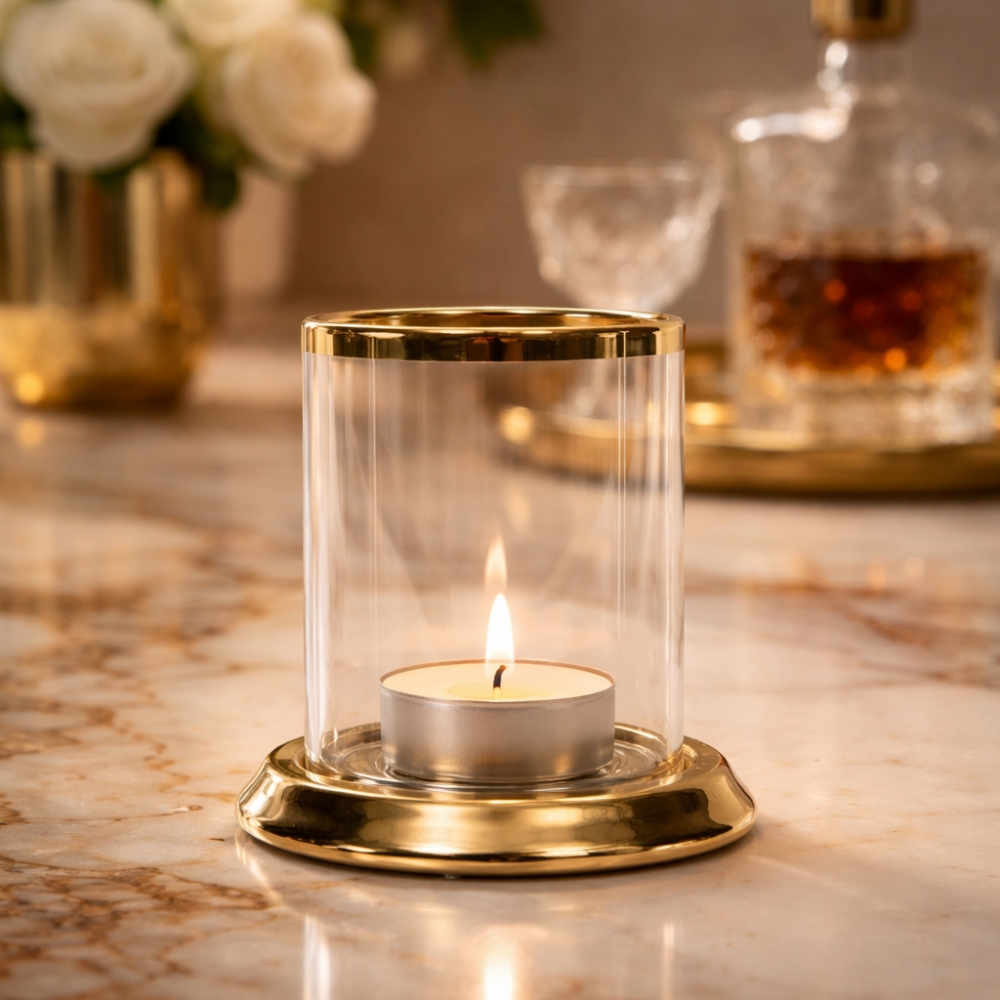 Lyslykt for telys i glass og keramikk D8 H8 cm gull.