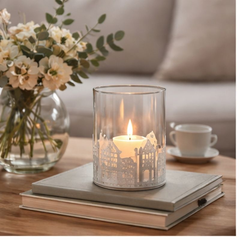 Lykt med glass og hus 10 cm hvit