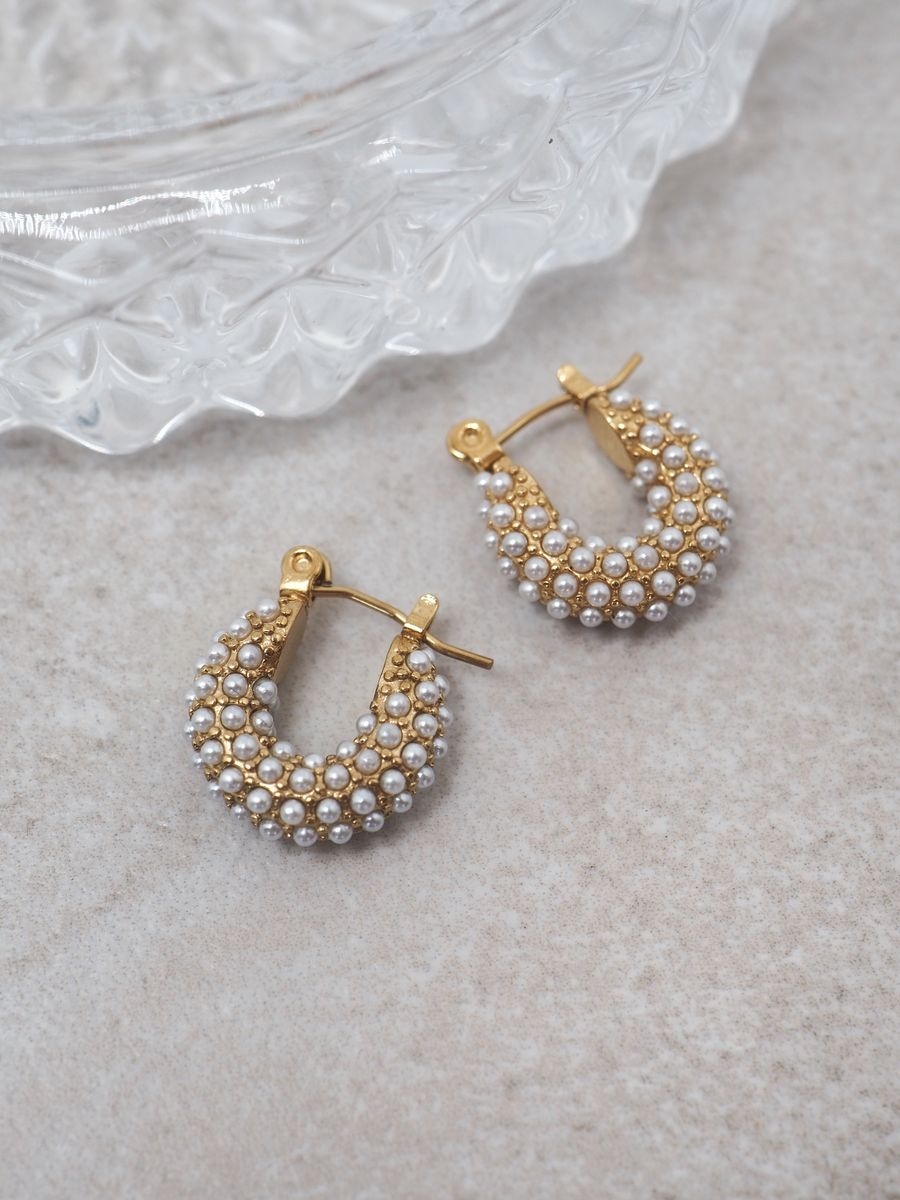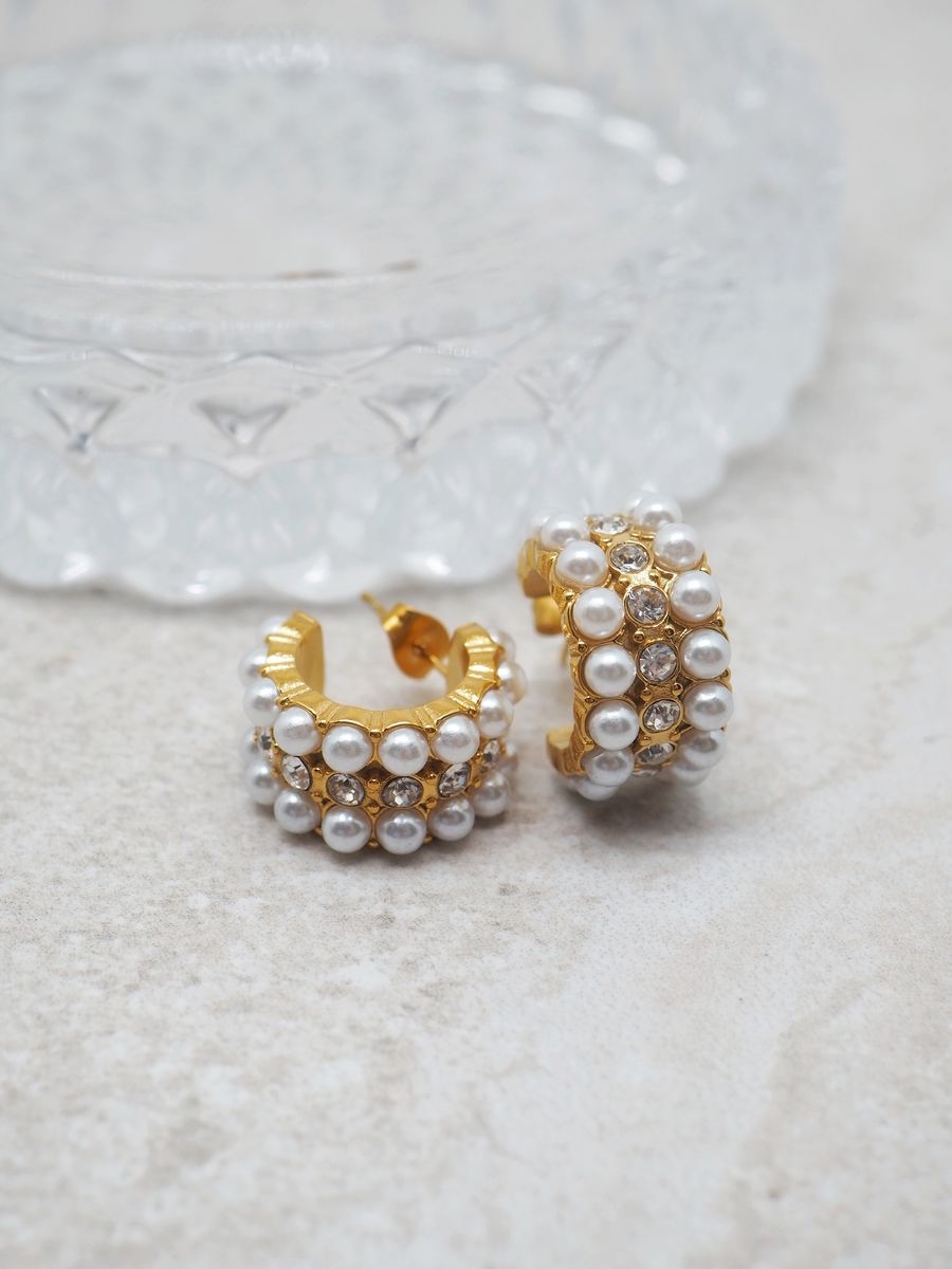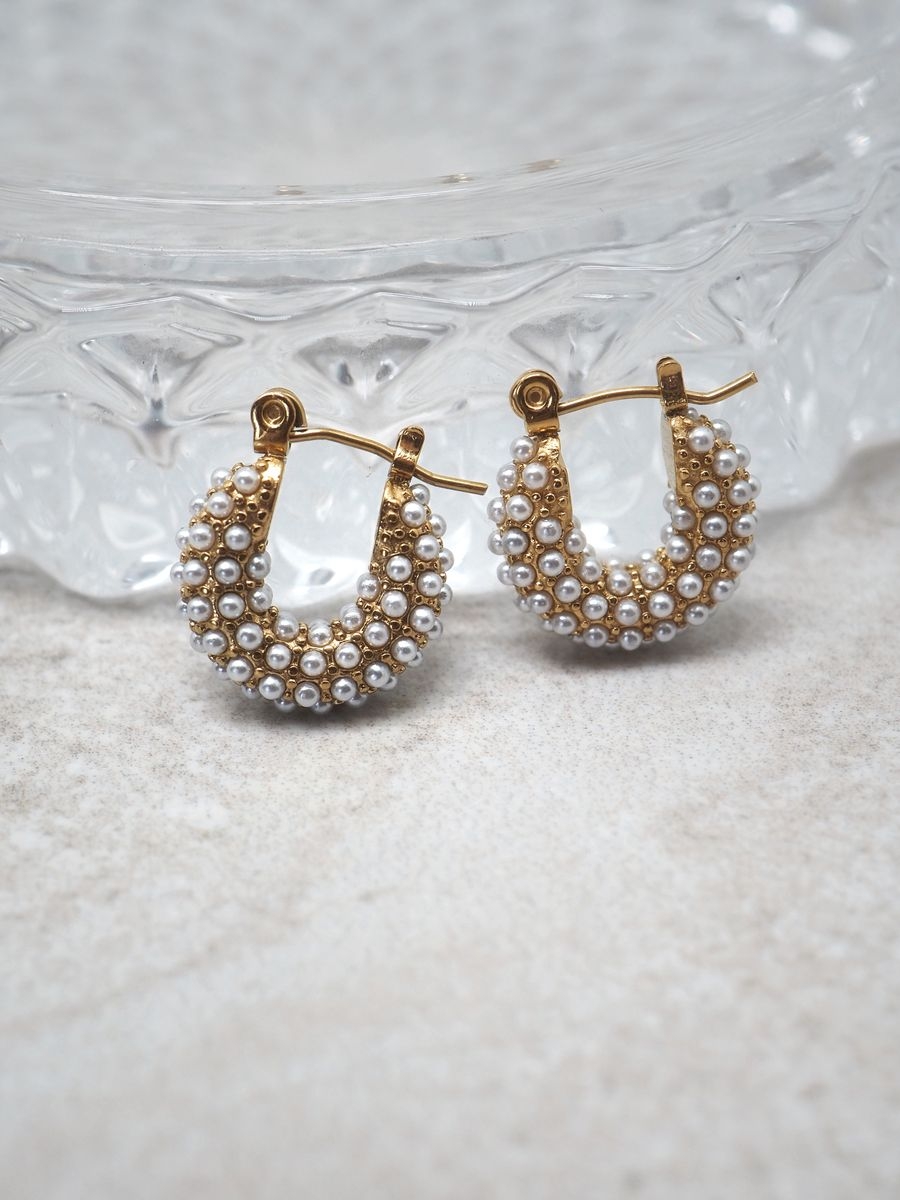 Disse nydelige hoopsene i gullfarget stainless steel kombinerer glansen fra små zirkoner med den myke elegansen fra hvite perler. Et klassisk og tidløst design som passer perfekt både til hverdags og fest.