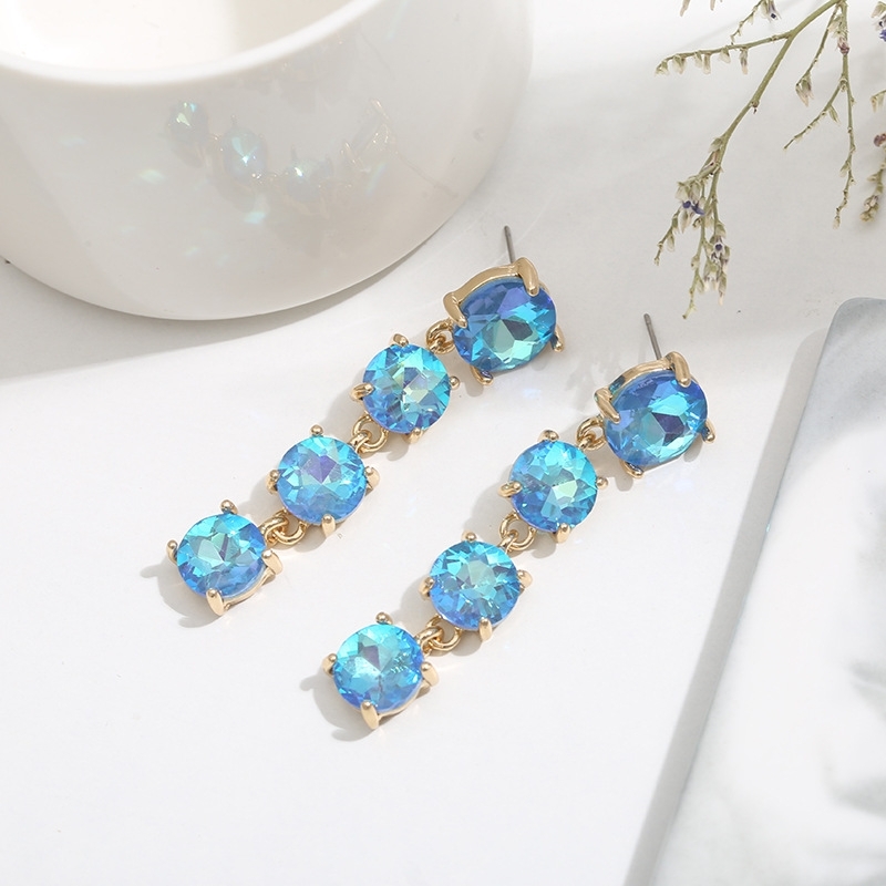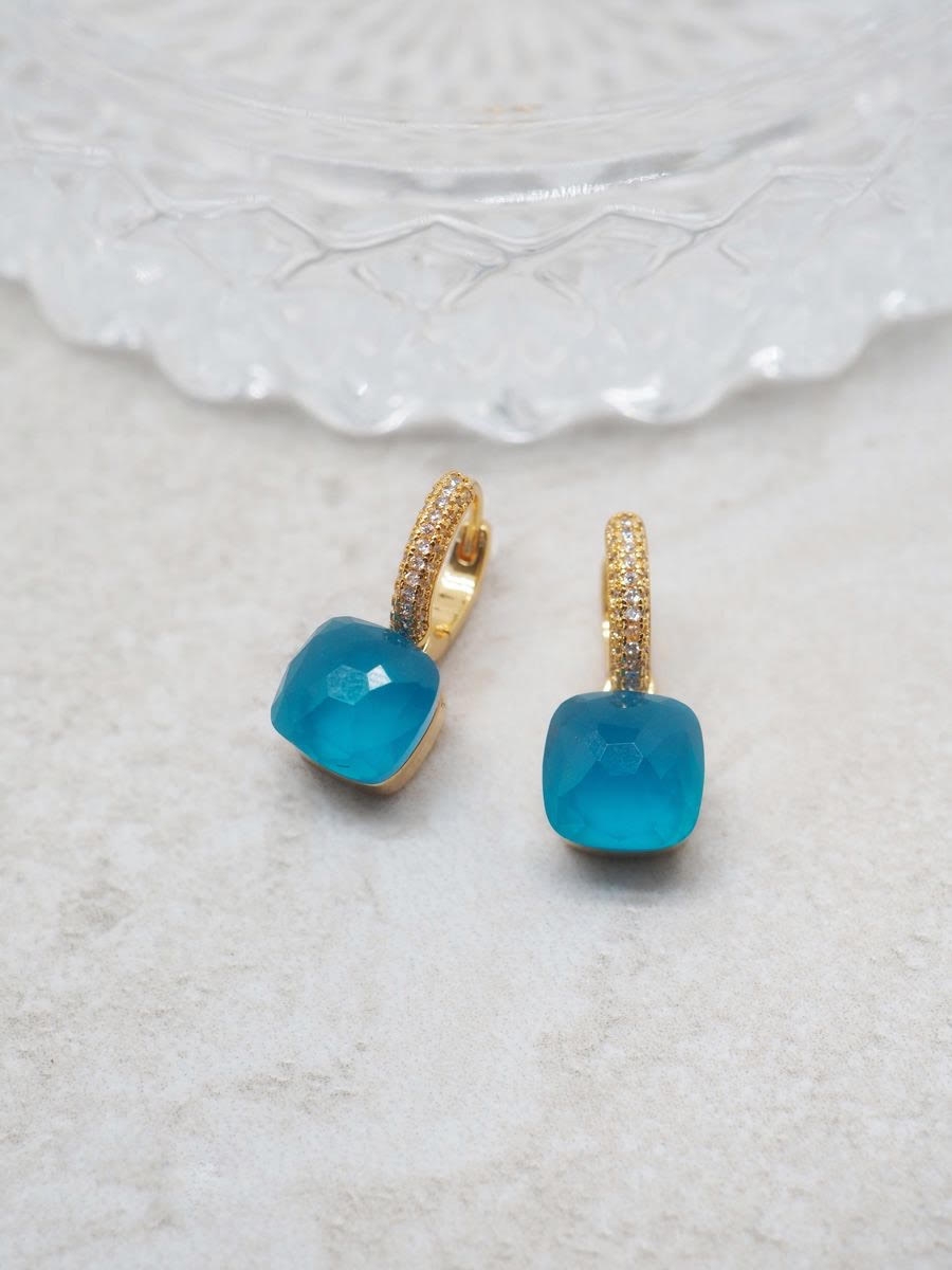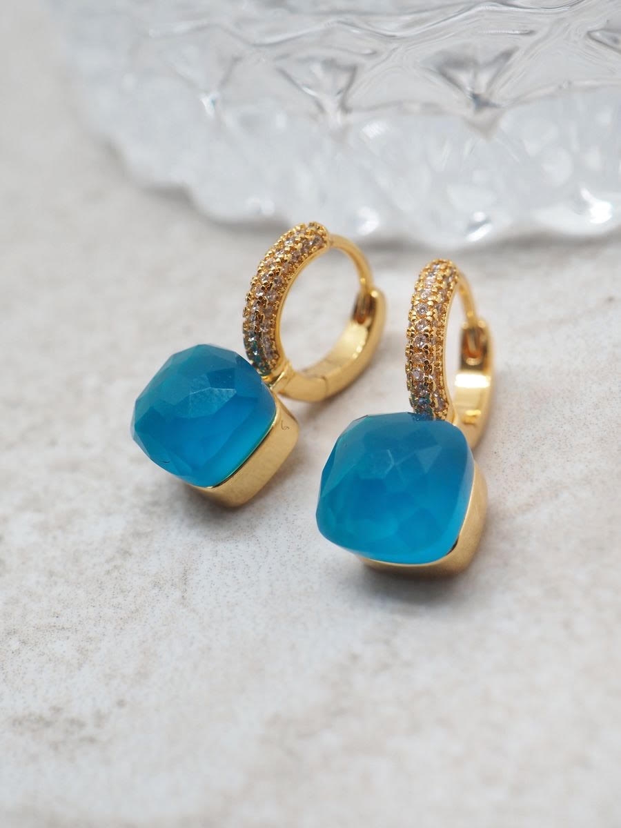 Nydelige øredobber med isblå glasstein. Øredobbene er ikke tunge. Nikkelfritt produkt, belagt med 18k gull. Lengde ca 2,5 cm.