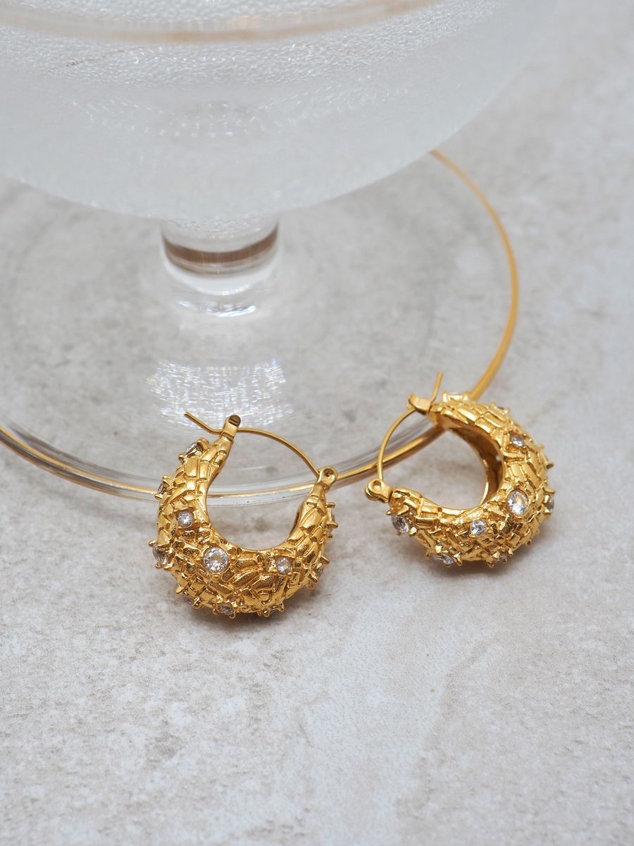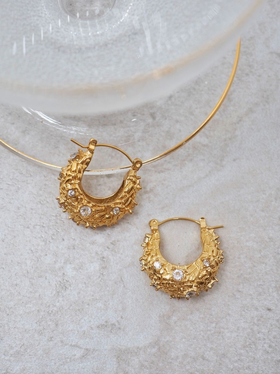 Disse gullfargede hesteskohoopsene i stainless steel kombinerer klassisk design med et subtilt glimt av små zirkoner. Hoopsene har en elegant hesteskoform som gir et unikt og moderne uttrykk, samtidig som de er lette og komfortable å bruke.