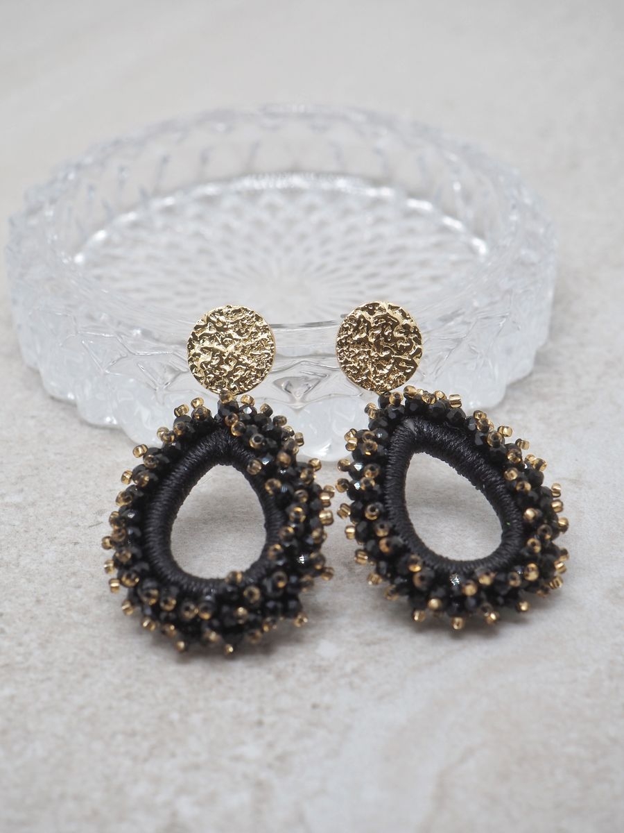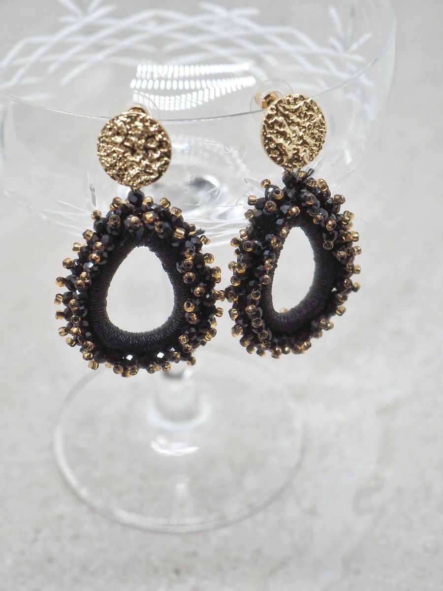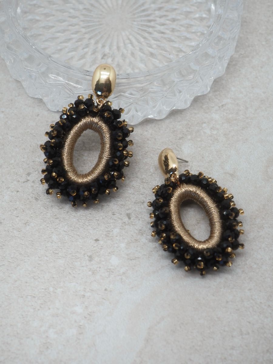 Nydelige øredobber med glassperler i svart gulldekor. Flotte øredobber til party og fest. Øredobbene er ikke tunge. Lengde: ca 5,5cm Nikkelfritt produkt.