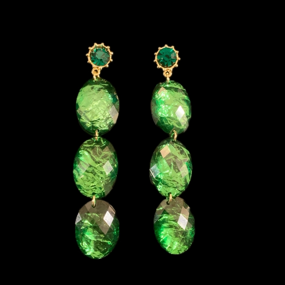 Glitre med sti - med disse elegante øredobbene med mørkegrønne glasssteiner. Med en lengde på ca 5,5 cm gir de et iøynefallende uttrykk samtidig som de er lette og komfortable å ha på gjennom hele kvelden.