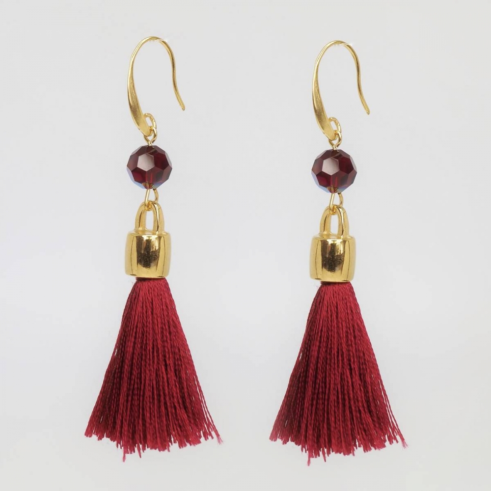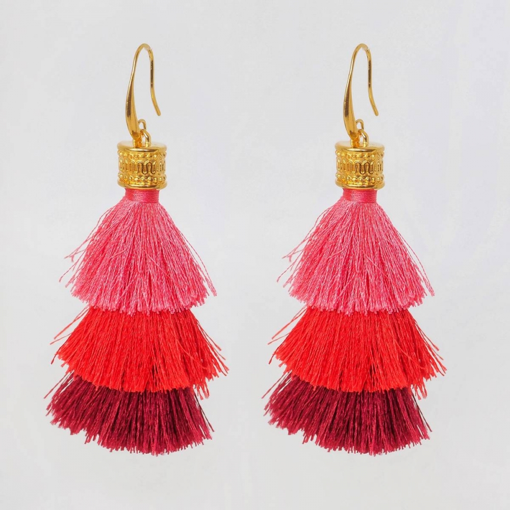 Øredobb med dusker i tre ulike rød toner. Titan i stiften i øret som er forgylt med 24 karat gull. Duskene henger i en flott børstet gull sylinder. Håndlaget i Hellas. Lengde 8,5 cm.