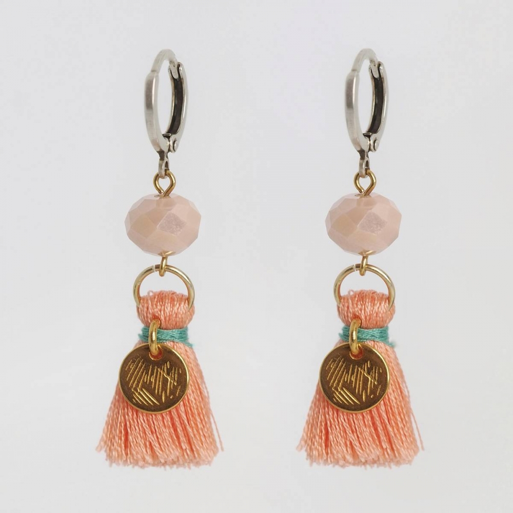 Supersøt øredobb med dusk. Ringen som øredobben sitter på er i sølv. På dusken henger det en rund plate som er i gull (forgylt) . Øredobben har en hvit glassperle med en lys korall farget dusk som ca er 2 cm. Hele øredobben er ca 5 cm.