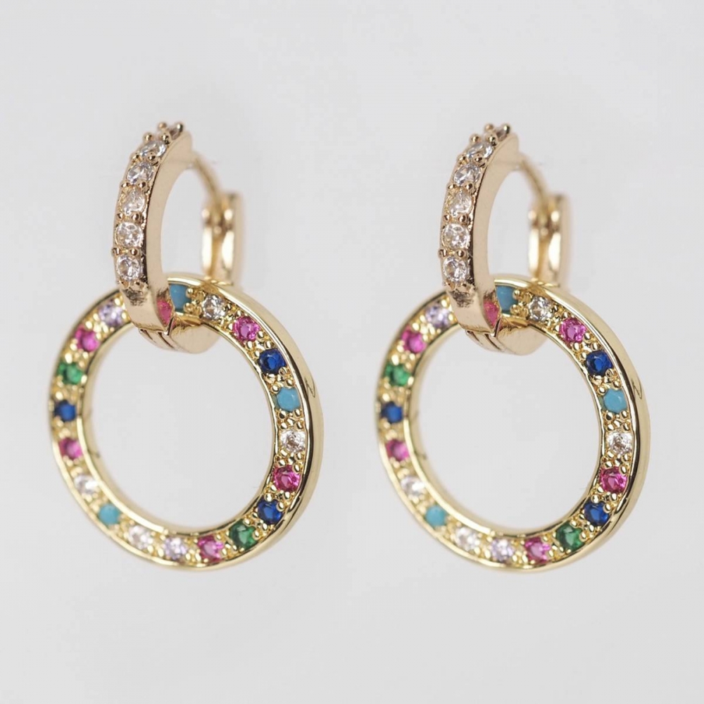 Klassiske og tidløse øredobber med flerfargede steiner/zirkonia. Øredobbene er belagt med 18k gull. Øredobbene er ikke tunge. Størrelse: ca 1.7cm Nikkelfri.