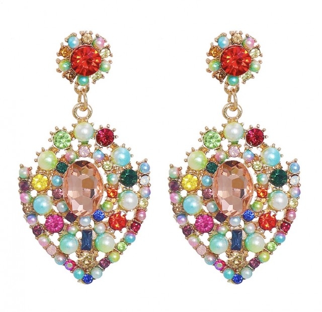 18K forgylte ørepynt med mulitfarget Zirkonia, perler og 925S sølvstift Høyde: 6 cm Bredde: Ca. 3.3 cm Materiale: Brass + 925S + Zirkonia + Perler Farge: Forgylt / Multifarget / Perler