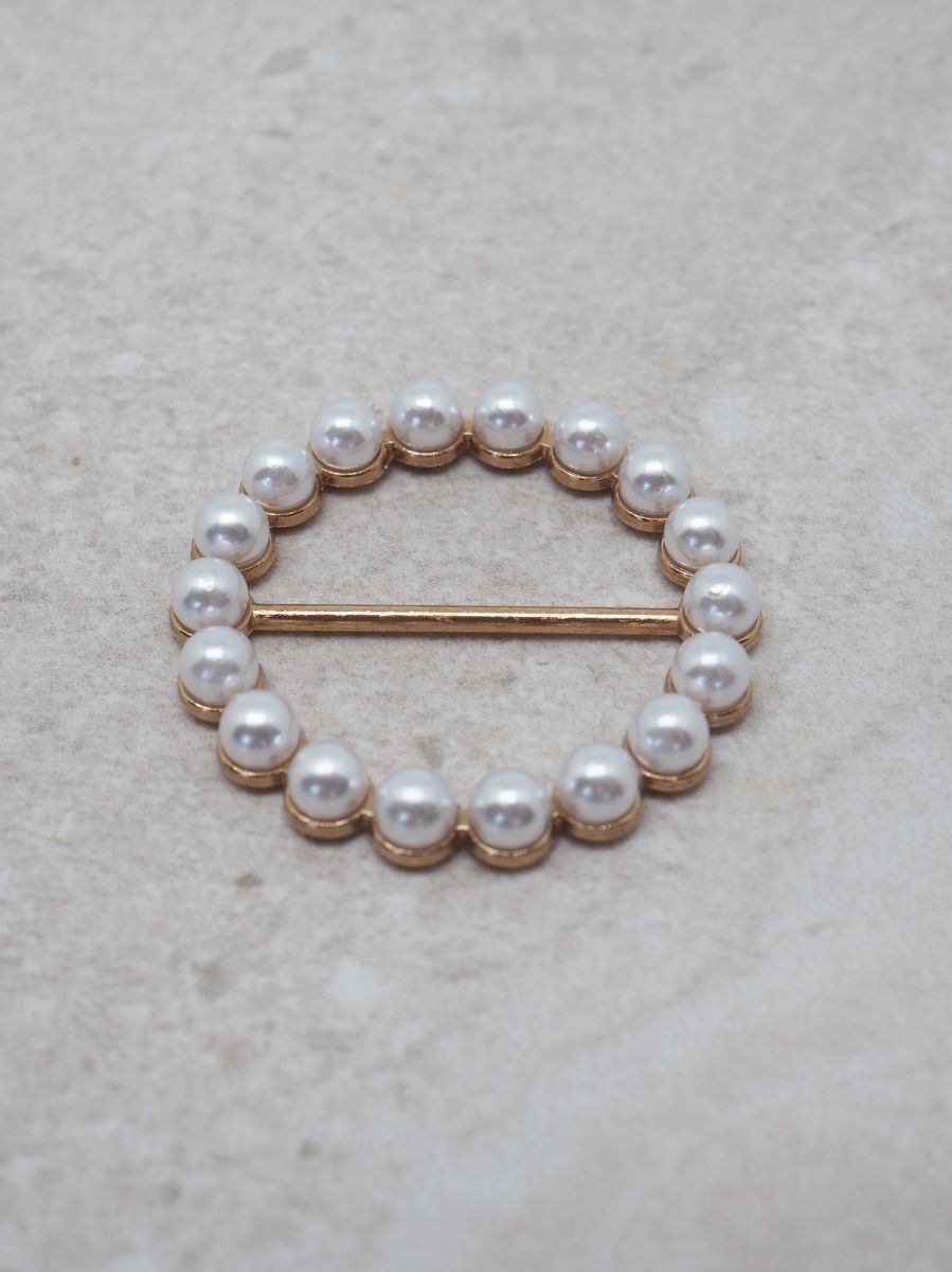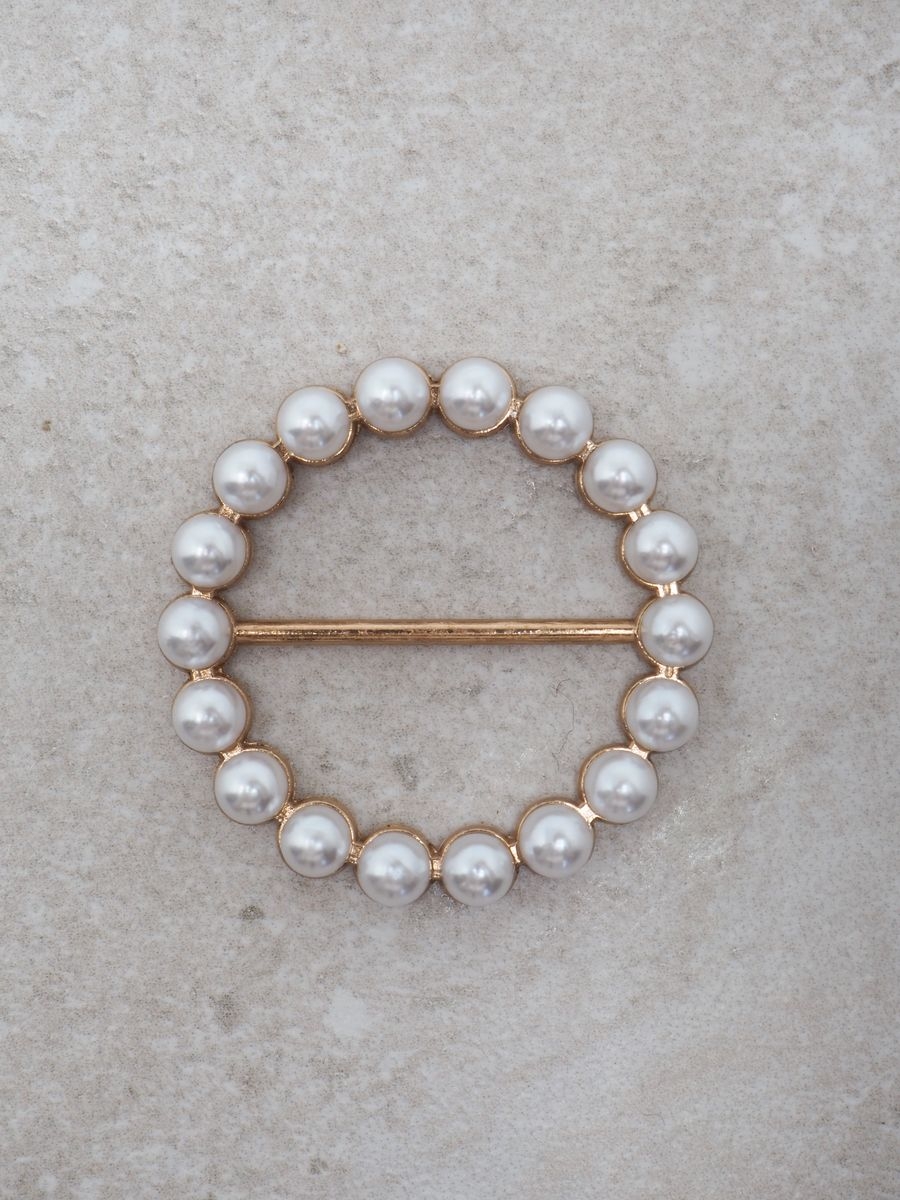 Denne gullfargede skjerfnålen er formet som en rund ring (ca. 4x3 cm) og dekorert med delikate perler som gir et feminint og elegant uttrykk.