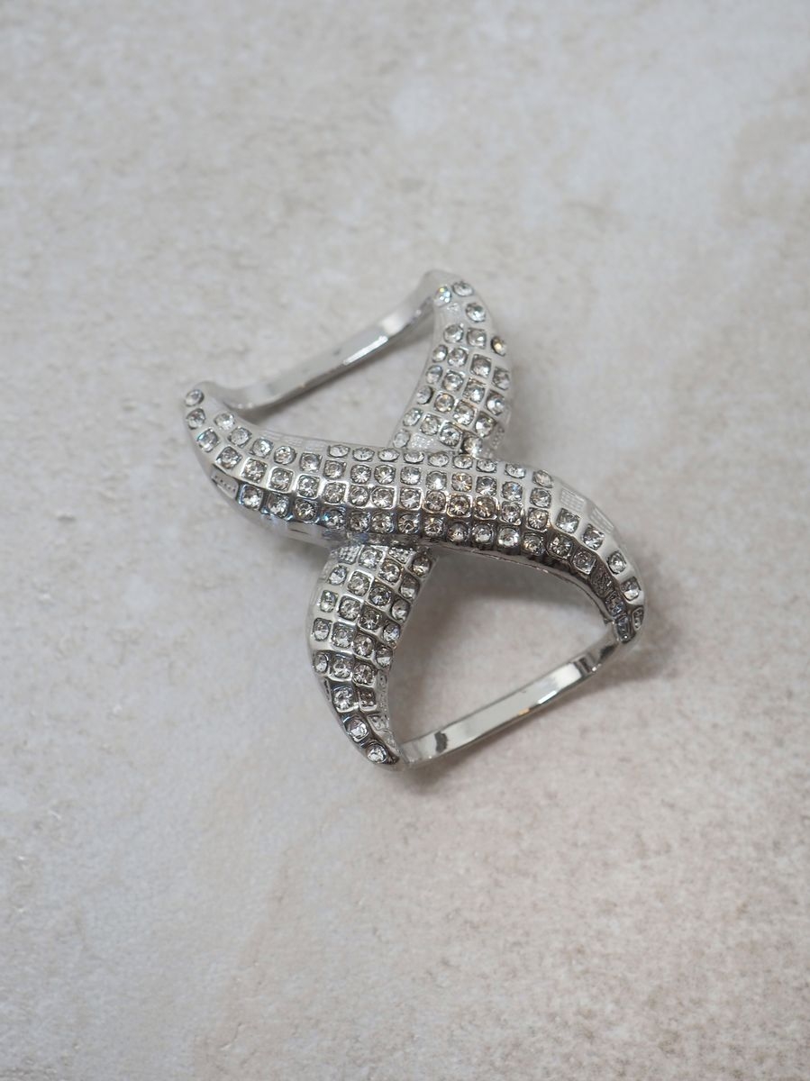 Denne sølvfargede skjerfnålen er formet som en vakker sløyfe og dekorert med glitrende blanke glassteiner som gir et luksuriøst preg. Med størrelsen ca. 5 x 3 cm er den ideell til å samle eller feste skjerf på en elegant måte, samtidig som den fungerer so