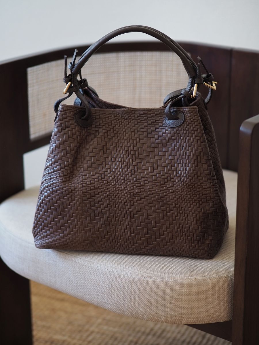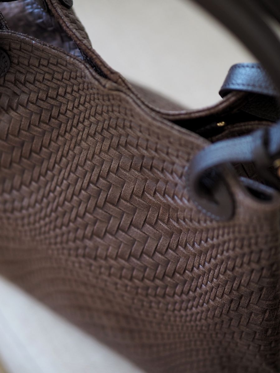 Denne mørkebrune italienske skinnvesken kombinerer tidløs eleganse med praktisk funksjonalitet. Det unike vortex-mønsteret – inspirert av virvlende bevegelser – gir vesken et særpreget og sofistikert uttrykk.