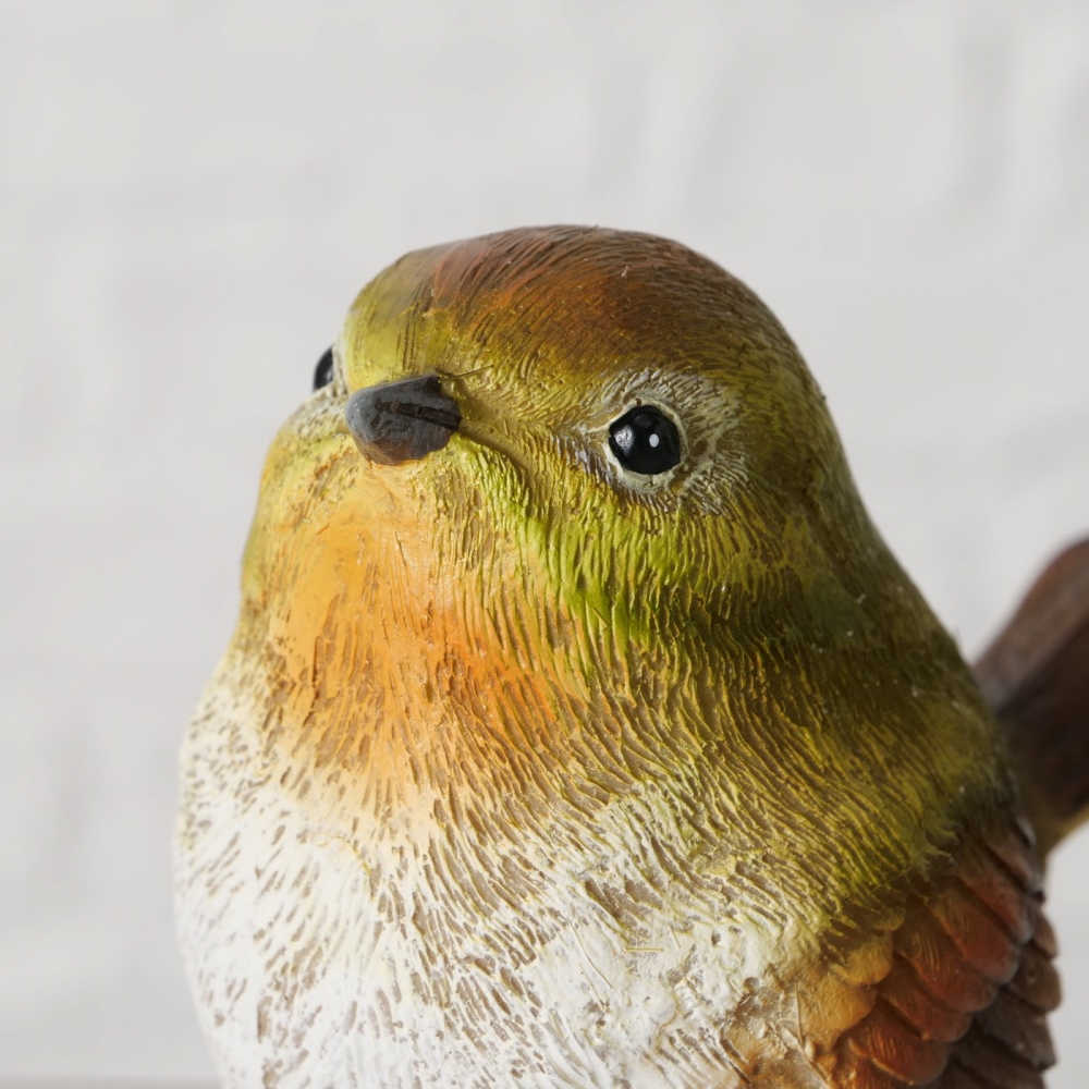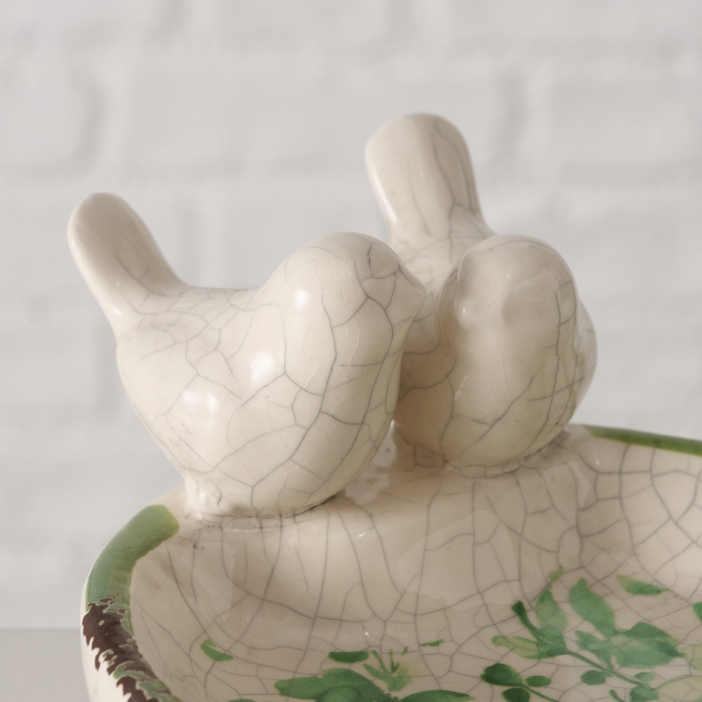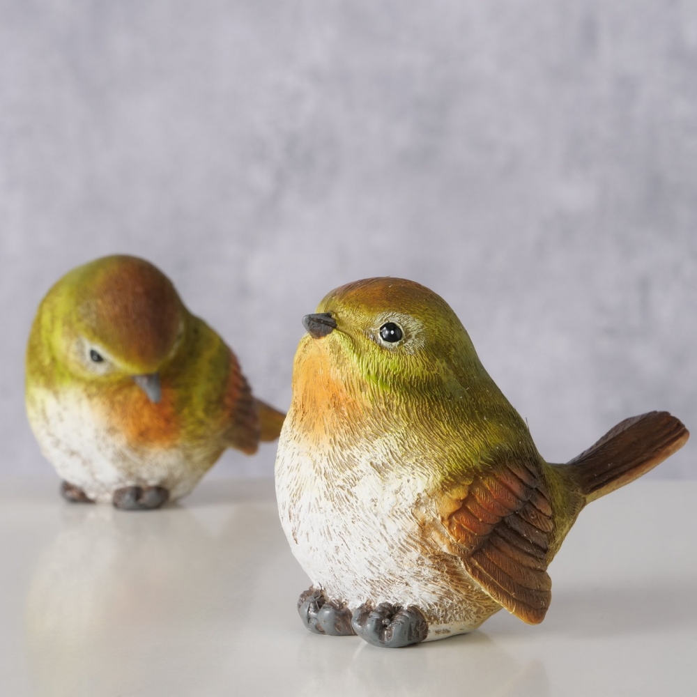 Fuglene er laget av grønn harpiks med en matt, håndmalt finish og pent håndverk. Fuglene er 7 cm høye og 10 cm brede.