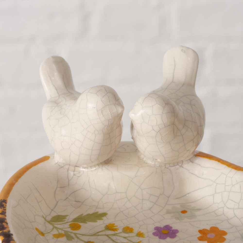 Fuglebadet har en håndlaget hjerteform, blank glasur, blomstertrykk rundt hele verket og krakeleringseffekt. Bredden er 20 cm, lengden 19 cm og høyden er 7,5 cm. Fuglebadet er frostbestandig, noe som sikrer at det er egnet for utendørs bruk året rundt.