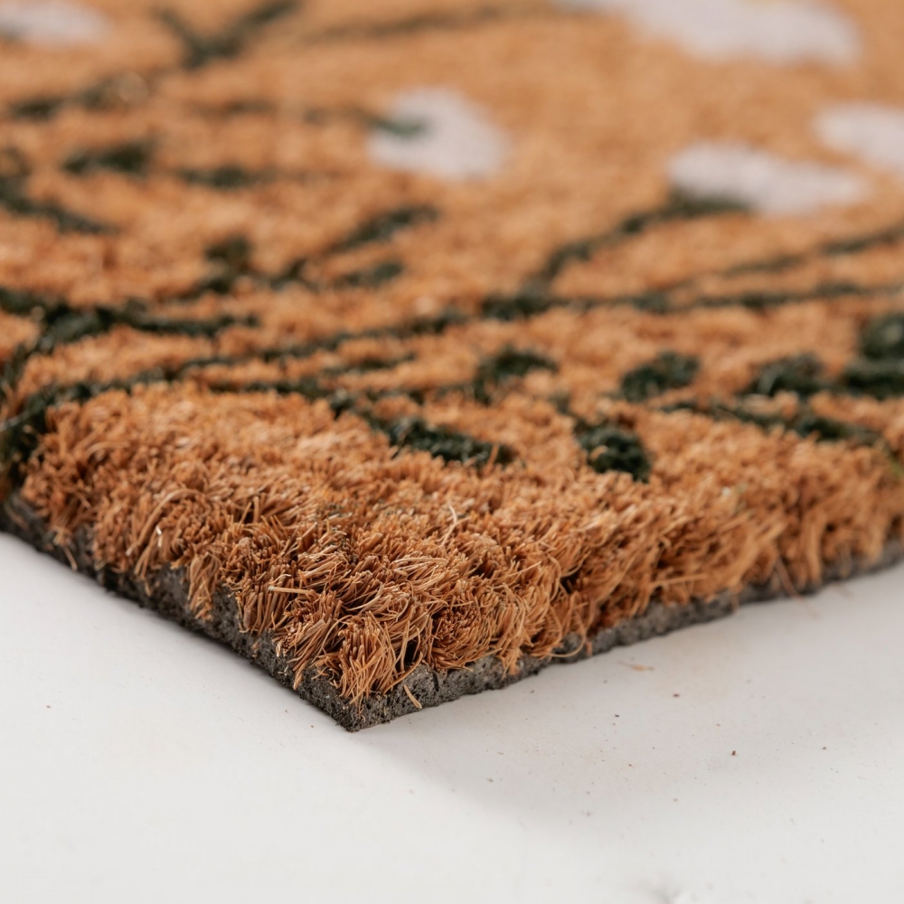 Dørmatten er laget av en kombinasjon av PVC og kokosfiber, med en matt overflatefinish og et flerfarget trykt motiv av blomstereng. Det rektangulære formatet måler 60 x 40 cm. Den integrerte sklisikringsfunksjonen øker sikkerheten i bruk.