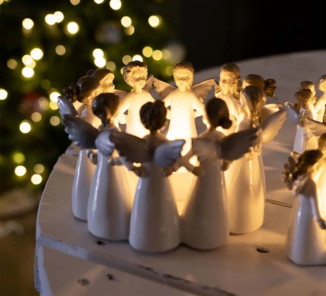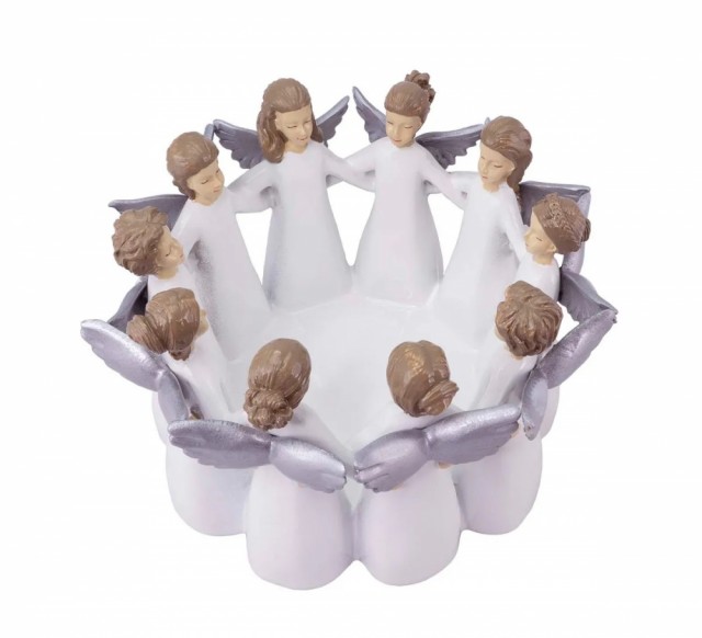 9 vakre engler med smilende fjes holder rundt hverandre i en ring. Hver engel er unik og har gyllent blondt hår, en hvit kjole og sølvfargede vinger.