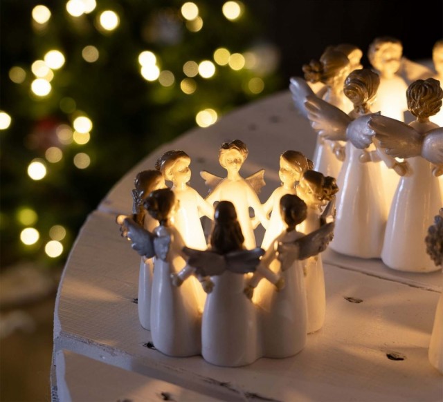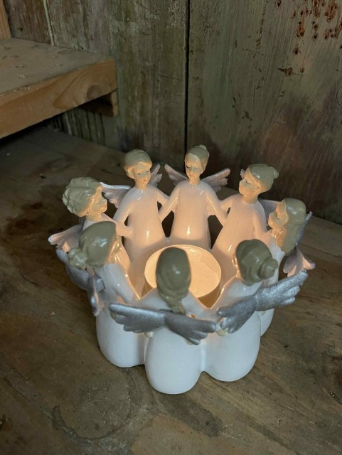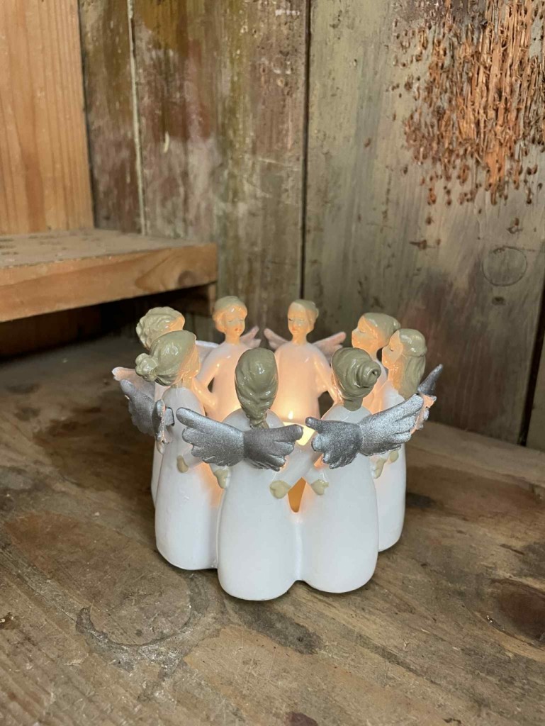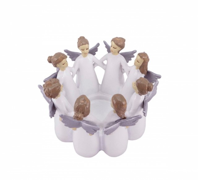 8 vakre engler med smilende fjes holder rundt hverandre i en ring. Hver engel er unik og har gyllent blondt hår, en hvit kjole og sølvfargede vinger. Plass til telys.