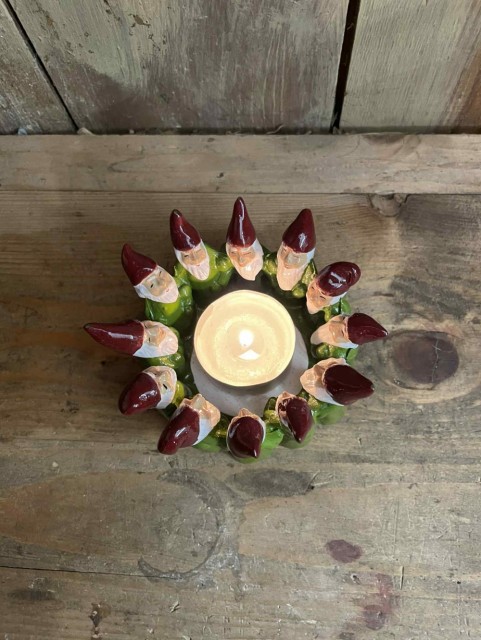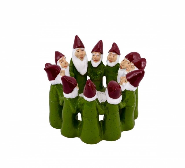 12 nisser kledd i røde luer og grønne frakker, står arm i arm i en sirkel der smil og julehygge deles mellom venner.