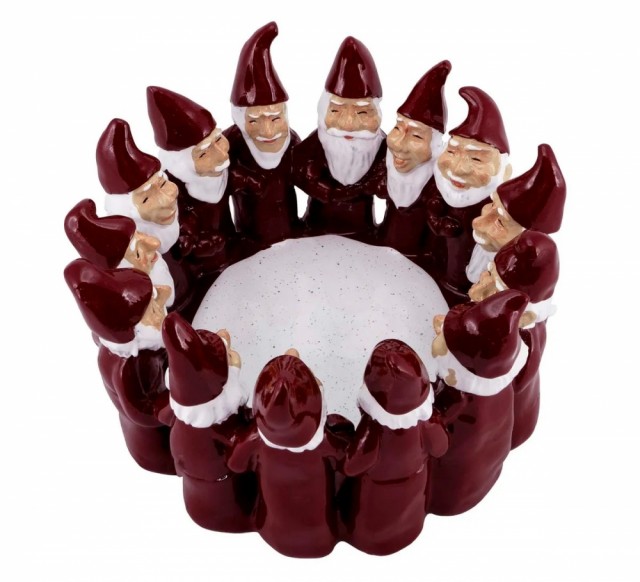 Disse 6 nissene, kledd i røde luer og frakker, spiller hvert sitt instrument rundt et bål. Med to trekkspill, et munnspill, en gitar, en bass og en sanger er denne gruppen mer en klar for å spille noen glade julesanger! Rom for telys.