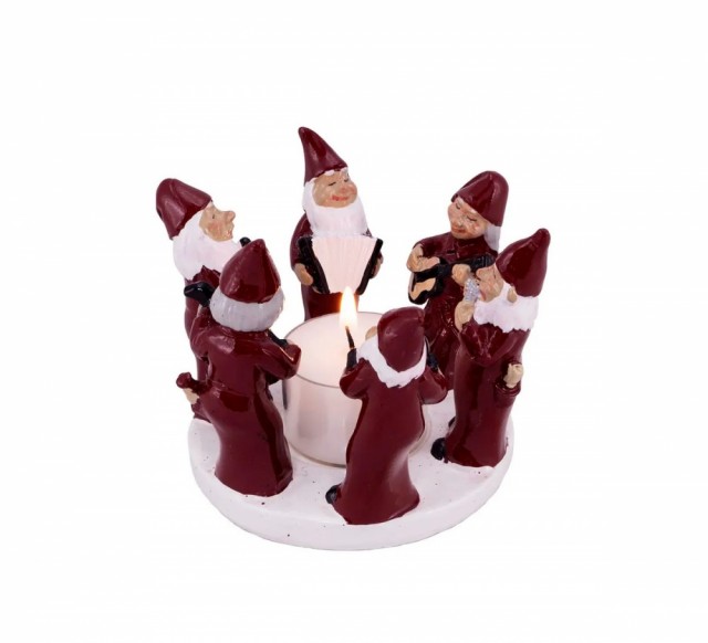 Disse 6 nissene, kledd i røde luer og frakker, spiller hvert sitt instrument rundt et bål. Med to trekkspill, et munnspill, en gitar, en bass og en sanger er denne gruppen mer en klar for å spille noen glade julesanger! Rom for telys.