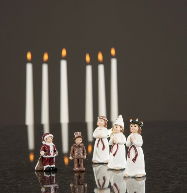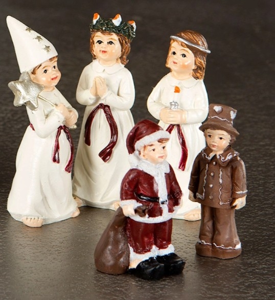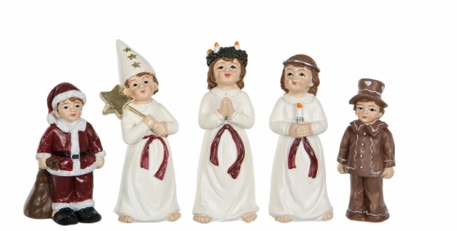Lucia tog - 5 deler Artikkelnr.: 101613 Herlig liten gjeng med en lucia, en brudepike, en stjernegutt, en pepperkakemann og en liten nisse. Figurene er inntil 7 cm høye. NOK189,00 inkl. mva. På lager Kjøp Del dette