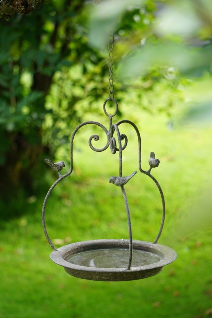 Fuglebad Artikkelnr.: 1002195 Hengende fuglebad med utsmykkede detaljer og søte små fugler. Perfekt å henge i et tre i hagen. Laget av metall. 24 x 30 cm. NOK249,00 inkl. mva. På lager Kjøp Del dette