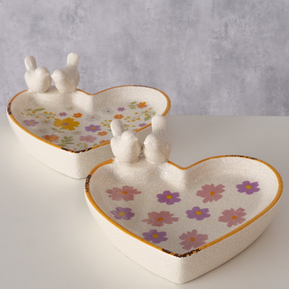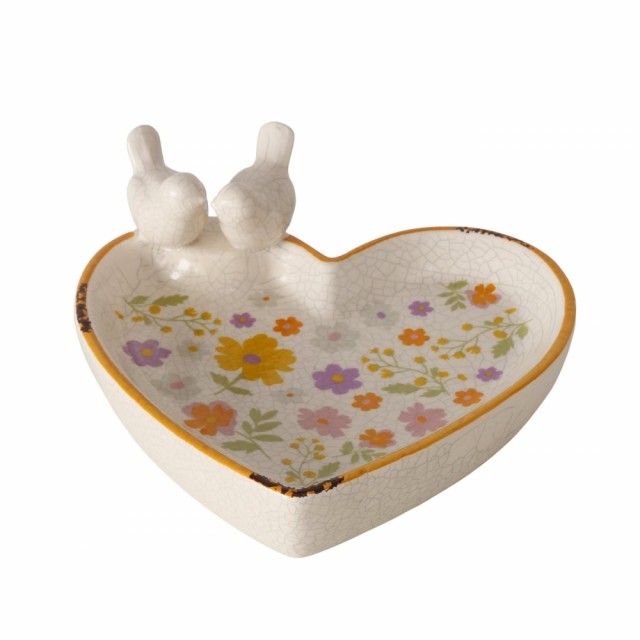 Fuglebadet har en håndlaget hjerteform, blank glasur, blomstertrykk rundt hele verket og krakeleringseffekt. Bredden er 20 cm, lengden 19 cm og høyden er 7,5 cm. Fuglebadet er frostbestandig, noe som sikrer at det er egnet for utendørs bruk året rundt.